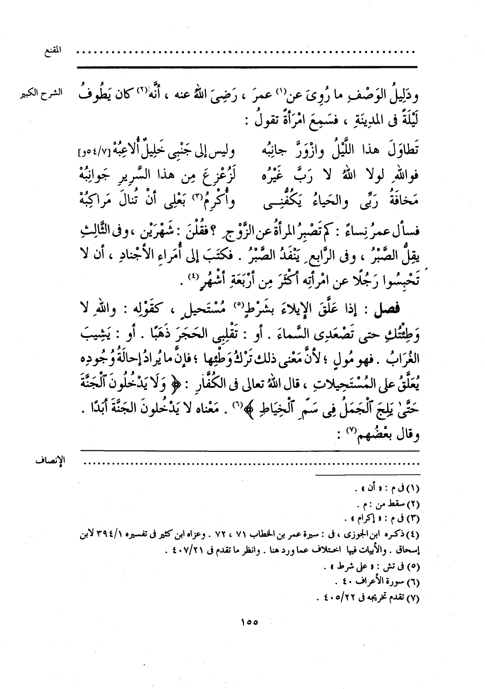 ودَلِيلُ الوَصْفِ ما رُوِيَ عن (¬1) عمرَ، رَضِيَ الله عنه، أنَّه (¬2) كان يَطُوفُ لَيلَةً في المدِينَةِ، فسَمِعَ امْرَأةً تقولُ:
