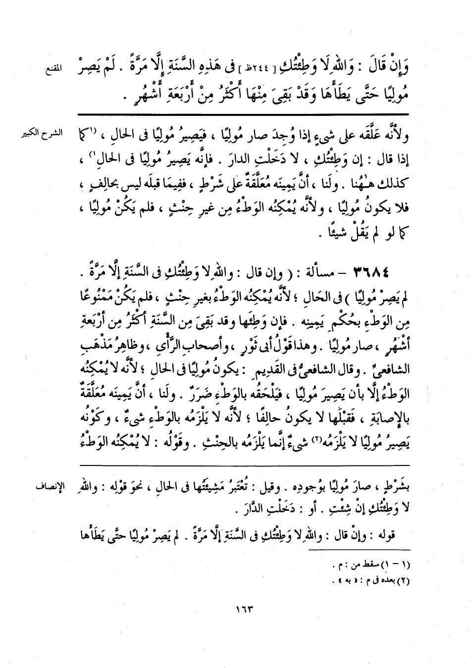 وَإنْ قَال: وَاللهِ لَا وَطِئْتُكِ في هَذِهِ السَّنَةِ إلا مَرَّةً. لَمْ يَصِرْ مُولِيًا حَتَّى يَطَأَها وَقَدْ بَقِيَ مِنْهَا أَكْثَرُ مِنْ أَربَعَةِ اشْهُر.