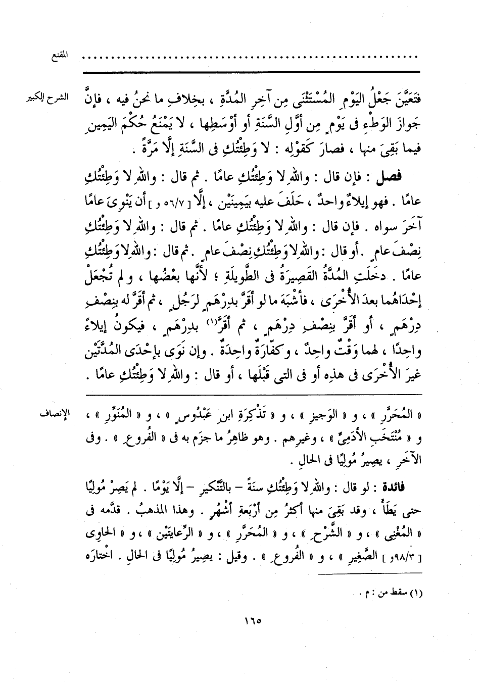فائدة: لو قال: واللهِ لا وَطِئْتُكِ سنَةً -بالتَّنْكيرِ- إلَّا يَوْمًا. لم يَصِرْ مُوليًا حتى يَطَأَ، وقد بَقِيَ منها أكثرُ مِن أرْبَعةِ أشْهُرٍ. وهذا المذهبُ. قدَّمه في «المُغْنِي»، و «الشرْحِ»، و «المُحَرَّرِ»، و «الرِّعايتَين»، و «الحاوي الصَّغِيرِ»، و «الفُروعِ». وقيل: يصِيرُ مُولِيًا في الحالِ. اخْتارَه