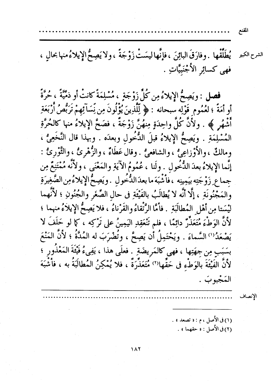 فصل: ويَصِحُّ الإِيلاءُ مِن كُلِّ زَوْجَةٍ، مُسْلِمَةً كانتْ أو ذمِّيَّةً، حُرَّةً أو أمَةً؛ لعُمُوم قَوْلِه سبحانه: {لِلَّذِينَ يُؤْلُونَ مِنْ نِسَائِهِمْ تَرَبُّصُ أَرْبَعَةِ أَشْهُرٍ}.ولأَنَّ كُلَّ واحِدَةٍ مِنهُنَّ زَوْجَة، فصَحَّ الإِيلاءُ منها كالحُرَّةِ المُسْلِمَةِ. ويَصِحُّ الإِيلاءُ قبلَ الدُّخُولِ وبعدَه. وبهذا قال النَّخَعِيُّ، ومالكٌ، والأوْزاعِيُّ، والشافعيُّ. وقال عَطَاءٌ، والزُّهْرِيُّ، والثَّوْرِيُّ: إنَّما الإِيلاءُ بعدَ الدُّخُولِ. ولَنا، عُمُومُ الآيَةِ والمَعْنَى، ولأنَّه مُمْتَنِعٌ مِن جِماعِ زَوْجَتِه بيَمِينِه، فأشْبَهَ ما بعدَ الدُّخُولِ. ويَصِحُّ الإِيلاءُ مِن الصَّغِيرَةِ والمَجْنُونَةِ، إلَّا أنَّه لا يُطالبُ بالفَيئَةِ في حالِ الصِّغَرِ والجُنُونِ؛ لأنَّهما ليسَتا مِن أهْلِ المُطالبَةِ. فأمَّا الرَّتْقاءُ والقَرْناءُ، فلا يَصِحُّ الإِيلاءُ منهما؛ لأنَّ الوَطْءَ مُتَعَذِّر دائِمًا، فلم تَنْعَقِدِ اليَمِينُ على تَرْكِه، كما لو حَلَفَ لا يَصْعَدُ (¬1) السَّماءَ. ويَحْتَمِلُ أنَّ يَصِحَّ، وتُضْربَ له المُدَّةُ؛ لأنَّ المَنْعَ بسَبَب مِن جِهَتِها، فهي كالمَرِيضَةِ. فعلَى هذا، يَفِئُ فَيئَةَ المَعْذُورِ؛ لأنَّ الفَيئَةَ بالوَطْءِ في حَقِّها (¬2) مُتَعَذِّرَة، فلا يُمْكِنُ المُطالبَةُ به، فأشبَهَ المَجْبوبَ.