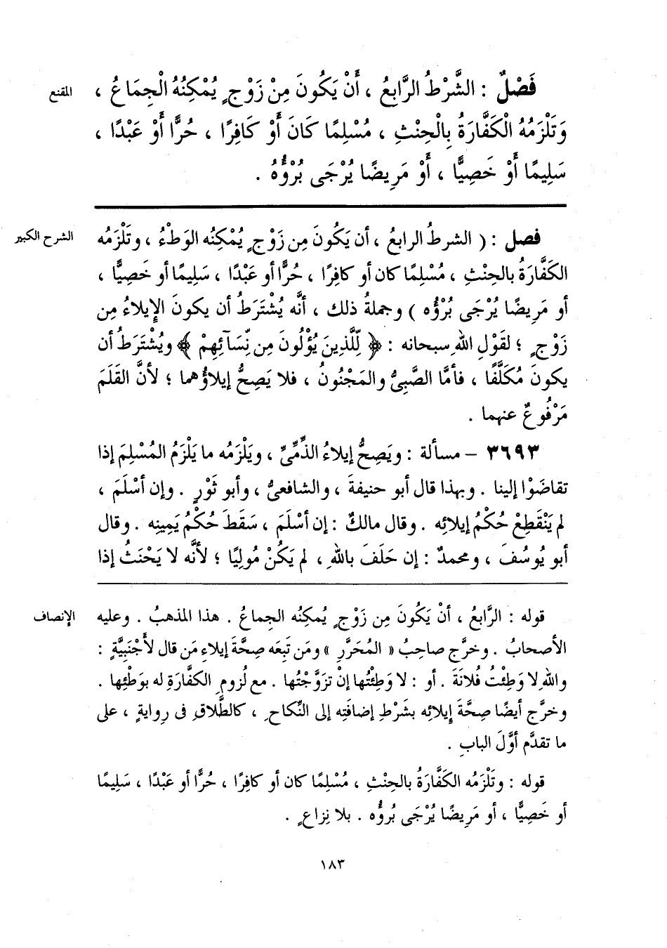 فَصلٌ: الشَّرْطُ الرَّابعُ، أنْ يَكُونَ مِنْ زَوْج يُمْكِنُهُ الْجِمَاعُ، وَتَلْزَمُهُ الْكَفَّارَةُ بِالْحِنْثِ، مُسْلِمًا كَانَ أوْ كَافِرًا، حُرًّا أوْ عَبْدًا، سَلِيمًا أَوْ خَصِيًّا، أَوْ مَرِيضًا يُرْجَى بُرْؤُهُ.