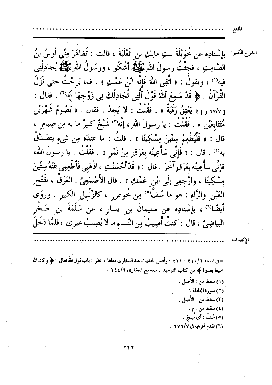 بإسْنادِه عن خُوَيلَةَ بنتِ مالكِ بنِ ثَعْلَبَةَ، قالت: تَظاهَرَ مِنِّي أوسُ بنُ الصَّامِتِ، فجِئْتُ رسولَ اللهِ - صلى الله عليه وسلم - أشْكُو، ورسَولُ اللهِ - صلى الله عليه وسلم - يُجادِلُنِي فيه (¬1)، ويقولُ: «اتَّقِي الله فَإنَّه ابْنُ عَمِّكِ». فما بَرِحْت حتى نَزَلَ القُرْآنُ: {قَدْ سَمِعَ اللَّهُ قَوْلَ الَّتِي تُجَادِلُكَ فِي زَوْجِهَا} (¬2). فقال: «يَعْتِقُ رَقَبَةً». فقُلْتُ: لا يَجِدُ. فقال: «يَصُومُ شَهْرَين مُتَتَابِعَين». فقُلْتُ: يا رسولَ اللهِ، إنَّه (¬3) شَيخٌ كبيرٌ ما به مِن صِيامٍ، قال: «فَلْيُطْعِمْ سِتِّينَ مِسْكِينًا». قلتُ: ما عندَه مِن شيءٍ يتصَدَّقُ به (¬4). قال: «فَإنِّي سَأعِينُه بِعَرَقٍ مِنْ تَمْرٍ». فقُلْتُ: يا رسولَ الله، فإنِّي سأعِينُه بعَرَقٍ آخَرَ. قال: «قَدْ أحْسَنْتِ، اذْهَبِي فَأطْعِمِي عنْهُ سِتِّينَ مِسْكِينًا، وارْجِعِي إلَى ابْنِ عَمِّكِ». قال الأصْمَعِيُّ: العَرَق، بفَتْحِ العَينِ والرَّاءِ: هو ما سُفَّ (¬5) مِن خُوصٍ، كالزِّنْبِيل الكبيرِ. وروَى أيضًا (¬6)، بإسْنادِه عن سليمانَ بنِ يسارٍ، عن سَلَمَةَ بنِ صَخْرٍ البَياضِيِّ، قال: كنت أصِيبُ مِن النِّساءِ ما لا يُصِيبُ غيرِي، فلمَّا دَخَلَ