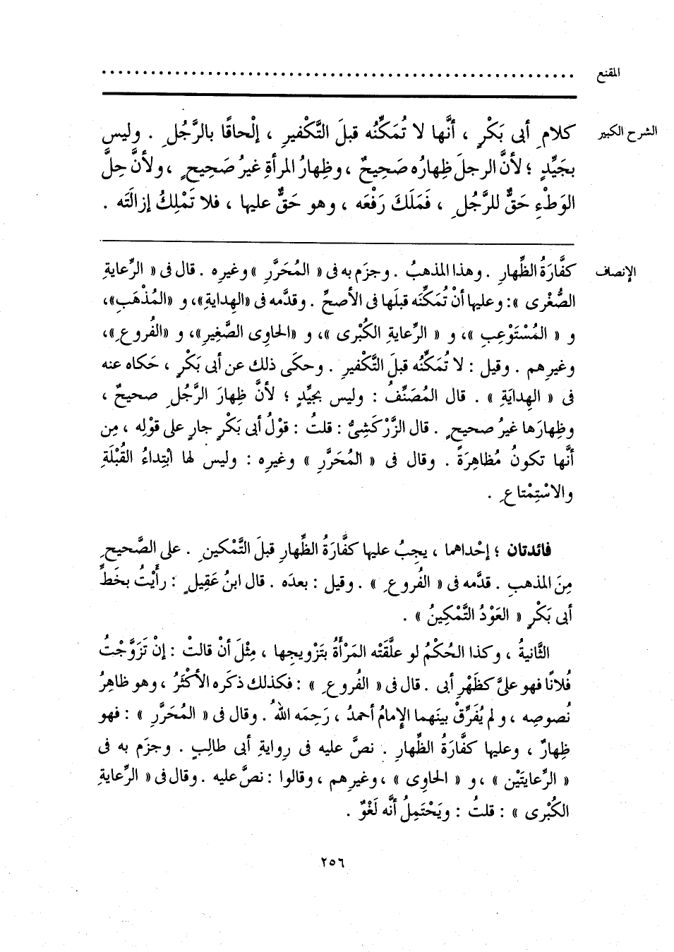 كفَّارَةُ الظِّهارِ. وهذا المذهبُ. وجزَم به في «المُحَرَّرِ» وغيرِه. قال في «الرِّعايةِ الصُّغْرى»: وعليها أنْ تُمَكِّنَه قبلَها في الأصحِّ. وقدَّمه في «الهِدايةِ»، و «المُذْهَبِ»، و «المُسْتَوْعِبِ»، و «الرِّعايةِ الكُبْرى»، و «الحاوي الصَّغِيرِ»، و «الفُروعِ»، وغيرِهم. وقيل: لا تُمَكِّنُه قبلَ التَّكْفيرِ. وحكَى ذلك عن أبي بَكْر، حَكاه عنه في «الهِدايَةِ». قال المُصَنِّفُ: وليس بجيِّدٍ؛ لأنَّ ظِهارَ الرَّجُلِ صحيح، وظِهارَها غيرُ صحيح. قال الزَّرْكَشِي: قلتُ: قوْلُ أبي بَكْرٍ جارٍ على قوْلِه، مِن أنَّها تكونُ مُظاهِرَة. وقال في «المُحَرَّرِ» وغيرِه: وليس لها ابتِداءُ القُبْلَةِ والاسْتِمْتاعِ.