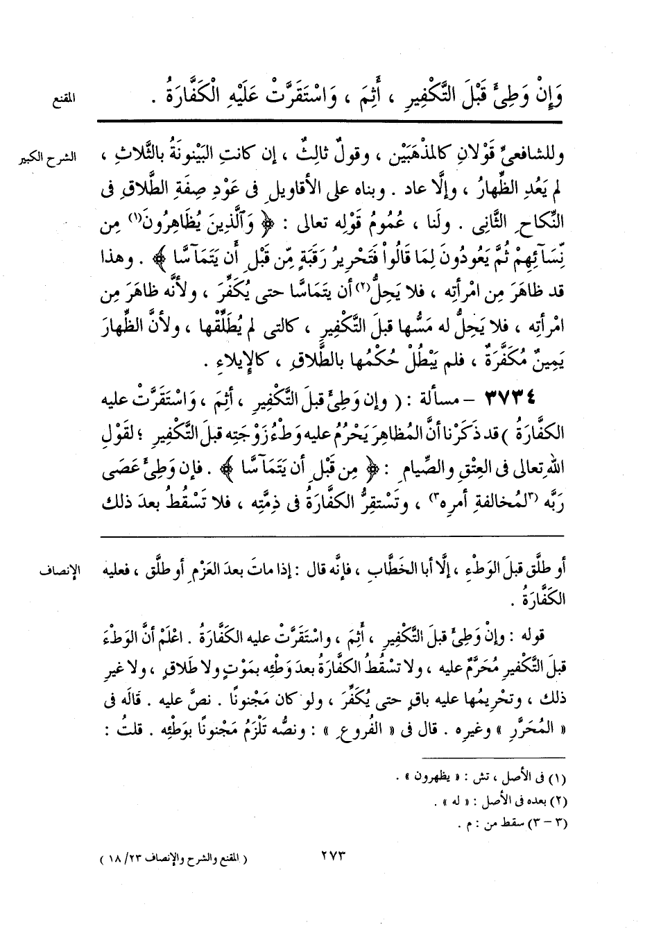 قوله: وإنْ وَطِيء قبلَ التَّكْفِيرِ، أثِمَ، واسْتَقَرَّتْ عليه الكَفَّارَةُ. اعْلَمْ أنَّ الوَطْءَ قبل التَّكْفيرِ مُحَرَّم عليه، ولا تسْقُطُ الكفَّارَةُ بعدَ وَطْئِه بمَوْتٍ ولا طَلاقٍ، ولا غيرِ ذلك، وتحْرِيمُها عليه باقي حتى يُكَفِّرَ، ولو كان مَجْنونًا. نصَّ عليه. قاله في «المُحَرَّرِ» وغيرِه. قال في «الفُروعِ»: ونصُّه تَلْزَمُ مَجْنونًا بوَطْئِه. قلتُ: