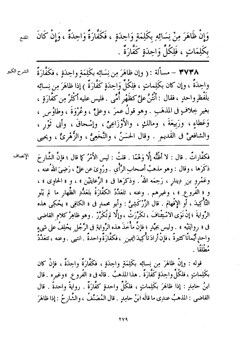 فكفَّاراتٌ. قال: لا أظُنُّه إلَّا وَهْمًا. قلتُ: ليس الأمْرُ كما قال؛ فإنَّ الشَّارِحَ ذكَرَها، وقال: وهو مذهبُ أصحابِ الرَّأْي. ورُوِيَ عن عليٍّ، رَضِيَ اللهُ عنه، وعَمْرِو بنِ دِينارٍ، رَحِمَه اللهُ. وذكرَها في «الرِّعايتَين»، و «الحاوي»، و «الفُروعِ»، وغيرِهم. وعنه، تتَعَدَّدُ الكفَّارَةُ بتَعَدُّدِ الظِّهارِ ما لم يَنْو التَّأْكِيدَ، أو الإفْهامَ. قال الزَّرْكَشِيُّ: وأبو محمدٍ في «الكافِي» يحْكِي هذه الرِّوايةَ؛ إنْ نوَى الاسْتِئْنافَ، تكَررتْ، وإلَّا لم تُكَرَّرْ. وهو ظاهِرُ كلامِ القاضي في «رِوايَتَيه». وليس بجيِّدٍ؛ فإن مأْخَذَ هذه الرِّوايةِ في الرجُلِ يحْلِفُ على شيءٍ واحدٍ أيمانًا كثيرةً، فإنْ أرادَ تأكيدَ اليمينِ، فكفَّارَة واحدة. انتهى. وعنه، تتعَدَّدُ مُطْلَقًا.