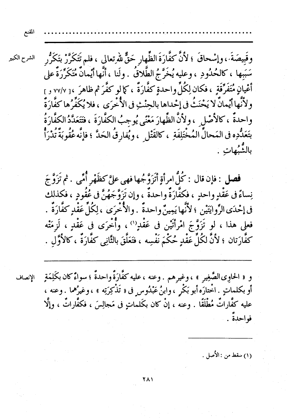 و «الحاوي الصَّغِيرِ»، وغيرِهم. وعنه، عليه كفَّارَةٌ واحدة؛ سواءٌ كان بكَلِمَةٍ أو بكلماتٍ. اخْتارَه أبو بَكْرٍ، وابنُ عَبْدُوسٍ في «تَذْكِرَتِه»، وغيرُهما. وعنه، عليه كفارات مُطْلَقًا. وعنه، إنْ كان بكَلمات في مَجالِسَ، فكفارات، وألَّا فواحدةٌ.