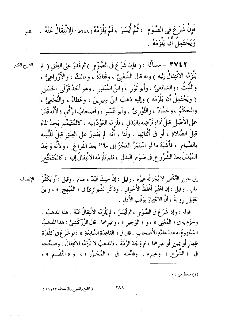 قوله: وإذا شَرَعَ في الصَّوْمِ، ثم أيسَرَ، لم يَلْزَمْه الانْتِقالُ عَنْهُ. هذا المذهبُ. وجزَم به في «المُغْنِي»، و «الوَجيزِ»، وغيرِهما. قال الزَّرْكَشِيُّ: هذا المذهبُ المَجْزومُ به عندَ عامَّةِ الأصحابِ. قال في «القاعِدَةِ السَّابِعَةِ»: لو شَرَعَ في كفَّارَةِ ظِهارٍ أو يمين أو غيرِهما، ثم وَجَدَ الرَّقَبَةَ، فالمذهبُ لا يَلْزَمُه الانْتِقالُ. وصحَّحه في «الشَّرْحِ» وغيرِه. وقدَّمه في «المُحَرَّرِ»، و «النَّظْمِ»،