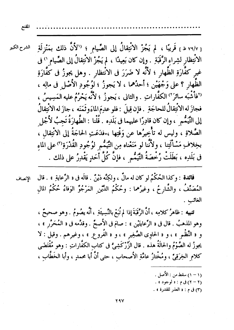 تنبيه: ظاهرُ كلامِه، أنَّ الرَّقَبَةَ إذا لم تُبَعْ بالنَّسِيئَةِ، أنَّه يصومُ. وهو صحيحٌ، وهو المذهبُ. قال في «الرِّعايتَين»: صامَ في الأصحِّ. وقدَّمه في «المُحَرَّرِ»، و «النَّظْمِ»، و «الحاوي الصَّغِير»، و «الفُروعِ»، وغيرِهم. وقيل: لا يجوزُ له الصوْمُ والحالةُ هذه. قال الزَّرْكَشِيُّ في كتاب الكفَاراتِ: وهو مُقتَضَى كلامِ الخِرَقِي، ومُخْتارُ عامَّةِ الأصحابِ، حتى أنَّ أبا محمدٍ، وأبا الخَطَّابِ،