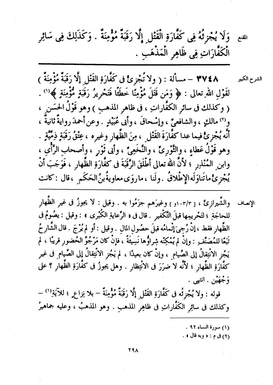 قوله: ولا يُجْزِئُه في كَفارَةِ القَتْلِ إلا رَقَبَةٌ مُؤمِنَةٌ -بلا نِزاعٍ؛ للآيَةِ (1) - وكذلك في سائِرِ الكَفَّاراتِ في ظاهِرِ المذهبِ. وهو المذهبُ، وعليه جماهيرُ