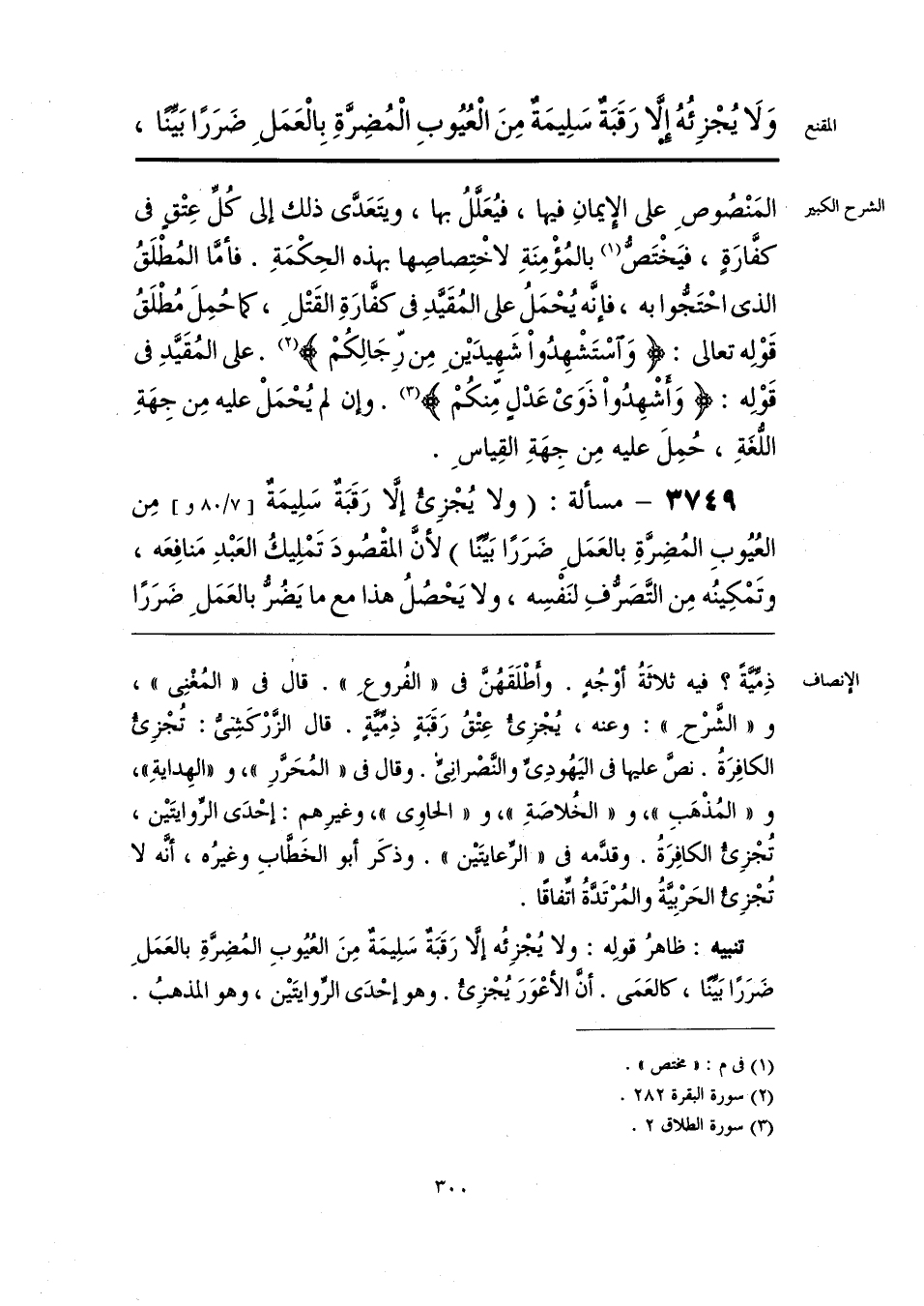 وَلَا يُجْزِئُهُ إلا رَقَبَةٌ سَلِيمَةٌ مِنَ الْعُيُوبِ الْمُضِرَّةِ بِالْعَمَلِ ضَرَرًا بَيِّنًا،