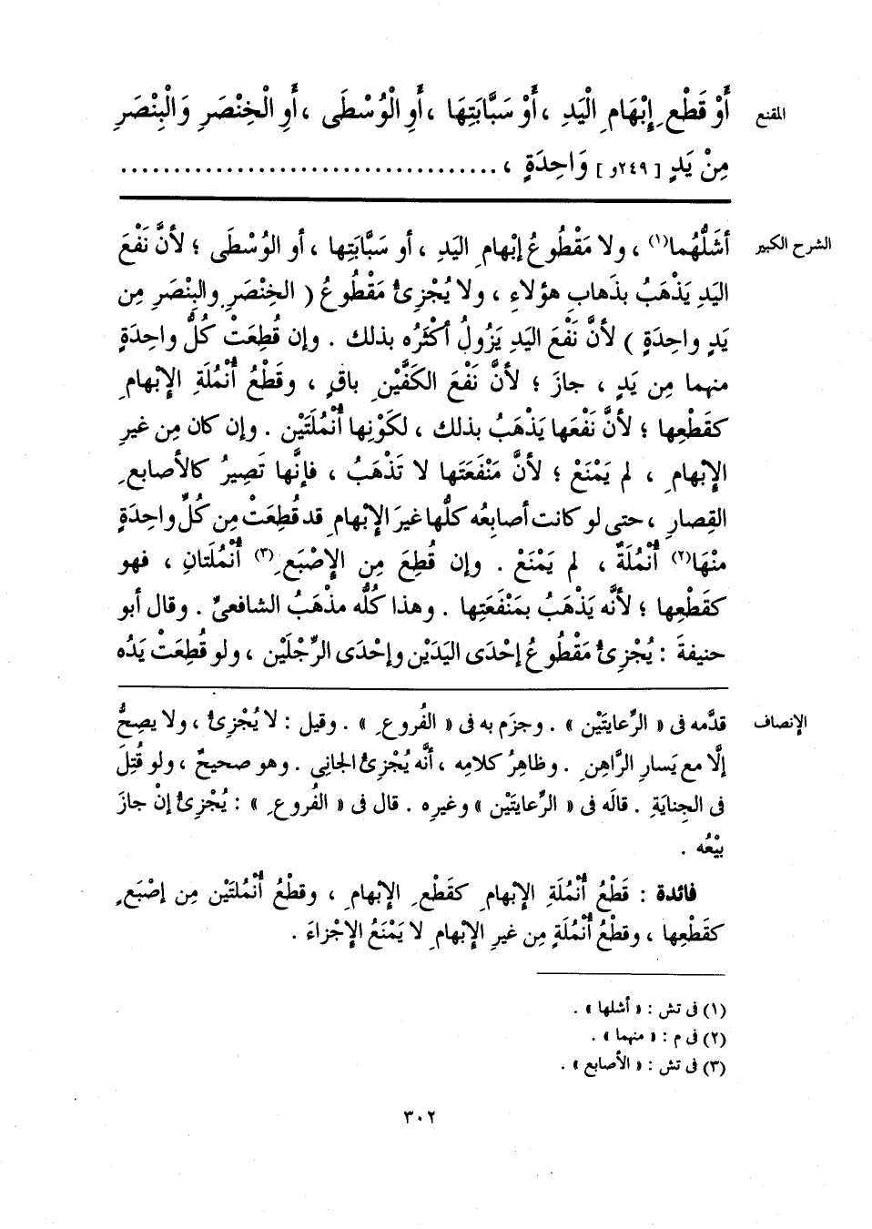 فائدة: قَطْعُ أُنْمُلَةِ الإبهامِ كقَطْعِ الإبهامِ، وقطْعُ أُنْمُلتَين مِن إصْبَعٍ كقَطْعِها، وقطْعُ أُنْمُلَةٍ مِن غيرِ الإبهامِ لا يَمْنَعُ الإجْزاءَ.