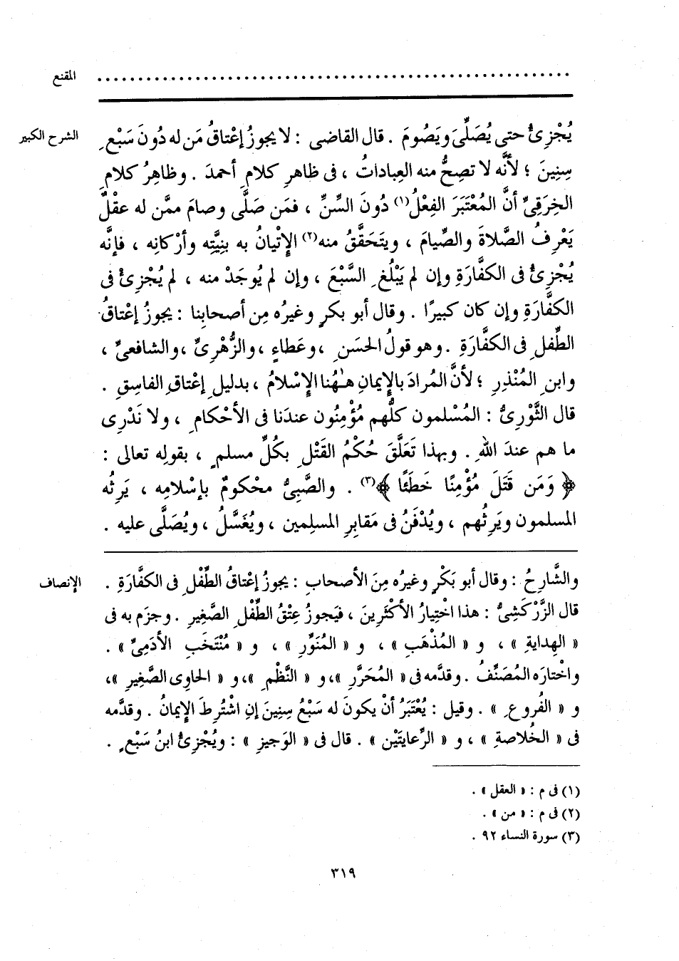 والشَّارِحُ: وقال أبو بَكْرٍ وغيرُه مِنَ الأصحابِ: يجوزُ إعْتاقُ الطِّفْلِ في الكفَّارَةِ. قال الزَّرْكَشِيُّ: هذا اخْتِيارُ الأكْثَرِينَ، فيَجوزُ عِتْقُ الطِّفْلِ الصَّغِيرِ. وجزَم به في «الهِدايةِ»، و «المُذْهَبِ»، و «المُنَوِّرِ»، و «مُنْتَخَبِ الأدَمِيِّ». واخْتارَه المُصَنِّفُ. وقدَّمه في «المُحَررِ»، و «النَّظْمِ»، و «الحاوي الصغِيرِ»، و «الفُروعِ». وقيل: يُعْتَبَرُ أنْ يكونَ له سَبْعُ سِنِينَ إنِ اشْتُرِطَ الإيمانُ. وقدَّمه في «الخُلاصةِ»، و «الرِّعايتَين». قال في «الوَجيزِ»: ويُجْزِئُ ابنُ سَبْع.