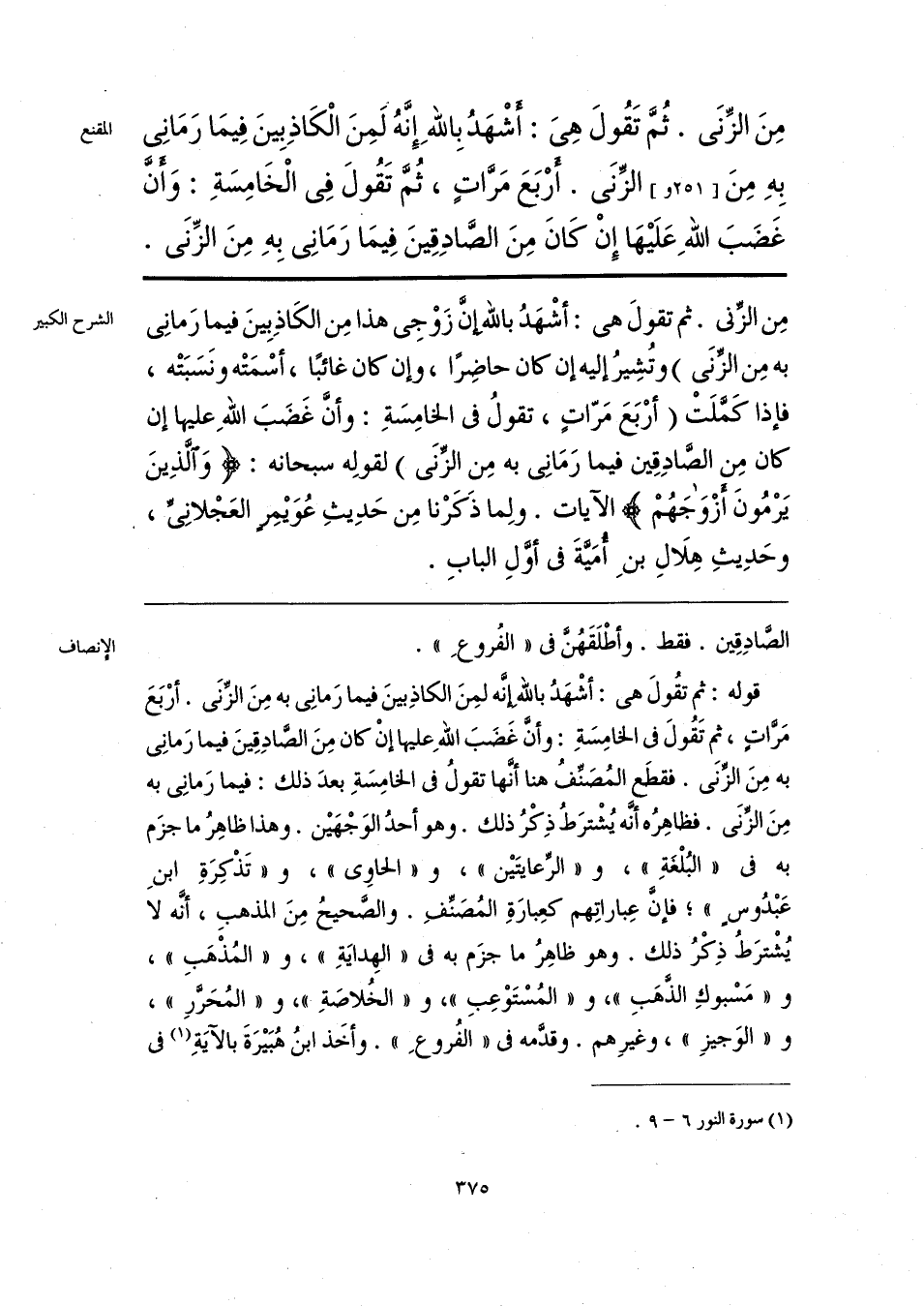قوله: ثم تقُولَ هي: أشْهَدُ بالله إنَّه لمِنَ الكاذِبينَ فيما رَمانِي به مِنَ الزِّنَى. أرْبَعَ مَراتٍ، ثم تَقُولَ في الخامِسَةِ: وأنَّ غَضَبَ الله عِليها إنْ كان مِنَ الصَّادِقِينَ فيما رَمانِي به مِنَ الزِّنى. فقطَع المُصَنِّفُ هنا أنَّها تقولُ في الخامِسَةِ بعدَ ذلك: فيما رَمانِي به مِنَ الزِّنَى. فظاهِرُه أنه يُشْترَطُ ذِكْرُ ذلك. وهو أحدُ الوَجْهَين. وهذا ظاهِرُ ما جزَم به في «البُلْغةِ»، و «الرِّعايتَين»، و «الحاوي»، و «تَذْكِرَةِ ابنِ عَبْدُوسٍ»؛ فإنَّ عِباراتِهم كعِبارَةِ المُصَنِّفِ. والصَّحيحُ مِنَ المذهبِ، أنَّه لا يُشْترَطُ ذِكْرُ ذلك. وهو ظاهِرُ ما جزَم به في «الهِدايَةِ»، و «المُذْهَبِ»، و «مَسْبوكِ الذَّهَبِ»، و «المُسْتَوْعِبِ»، و «الخُلاصَةِ»، و «المُحَرَّرِ»، و «الوَجيزِ»، وغيرِهم. وقدَّمه في «الفُروعِ». وأخَذ ابنُ هُبَيرَةَ بالآيَةِ (¬1) في