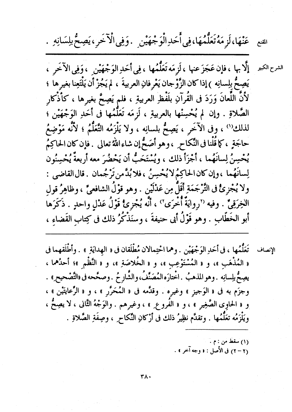 تَعَلُّمُها، في أحَدِ الوَجْهَين. وهما احْتِمالان مُطْلَقان في «الهِدايَةِ». وأطْلَقهما في «المُذْهَبِ»، و «المُسْتَوْعِبِ»، و «الخُلاصَةِ»، و «النَّظْمِ»، أحدُهما، يصِحُّ بلِسانِه. وهو المذهبُ. اخْتارَه المُصَنِّفُ، والشَّارِحُ. وصحَّحه في «التَّصْحيحِ». وجزَم به في «الوَجيزِ» وغيرِه. وقدَّمه في «المُحَرَّرِ»، و «الرِّعايتَين»، و «الحاوي الصَّغِيرِ»، و «الفُروعِ»، وغيرِهم. والوَجْهُ الثَّاني، لا يصِحُّ، ويَلْزَمُه تعَلُّمُها. وتقدَّم نظِيرُ ذلك في أرْكانِ النِّكاحِ، وصِفَةِ الصَّلاةِ.