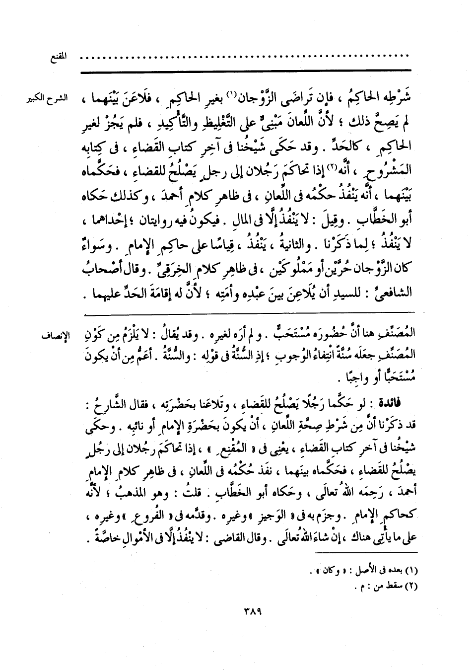 فائدة: لو حَكَّما رَجُلًا يَصْلُحُ للقَضاءِ، وتَلاعَنا بحَضْرَتِه، فقال الشَّارِحُ: قد ذكَرْنا أنَّ مِن شَرْطِ صِحَّةِ اللِّعانِ، أنْ يكونَ بحَضْرَةِ الإمامِ أو نائبِه. وحَكَى شيخُنا في آخرِ كتابِ القَضاءِ، يعْنِي في «المُقنِعِ»، إذا تحاكَمَ رجُلان إلى رجُلٍ يصْلُحُ للقَضاءِ، فحَكَّماه بينَهما، نفَذ حُكْمُه في اللِّعانِ، في ظاهِرِ كلامِ الإمامِ أحمدَ، رَحِمَه اللهُ تعالى، وحَكاه أبو الخَطَّاب. قلتُ: وهو المذهبُ؛ لأنَّه كحاكمِ الإِمامِ. وجزَم به في «الوَجيزِ» وغيرِه. وقدَّمه في «الفُروعِ» وغيرِه، على ما يأْتِي هناك، إنْ شاءَ الله تُعالى. وقال القاضي: لا ينْفُذُ إلا في الأمْوالِ خاصَّةً.