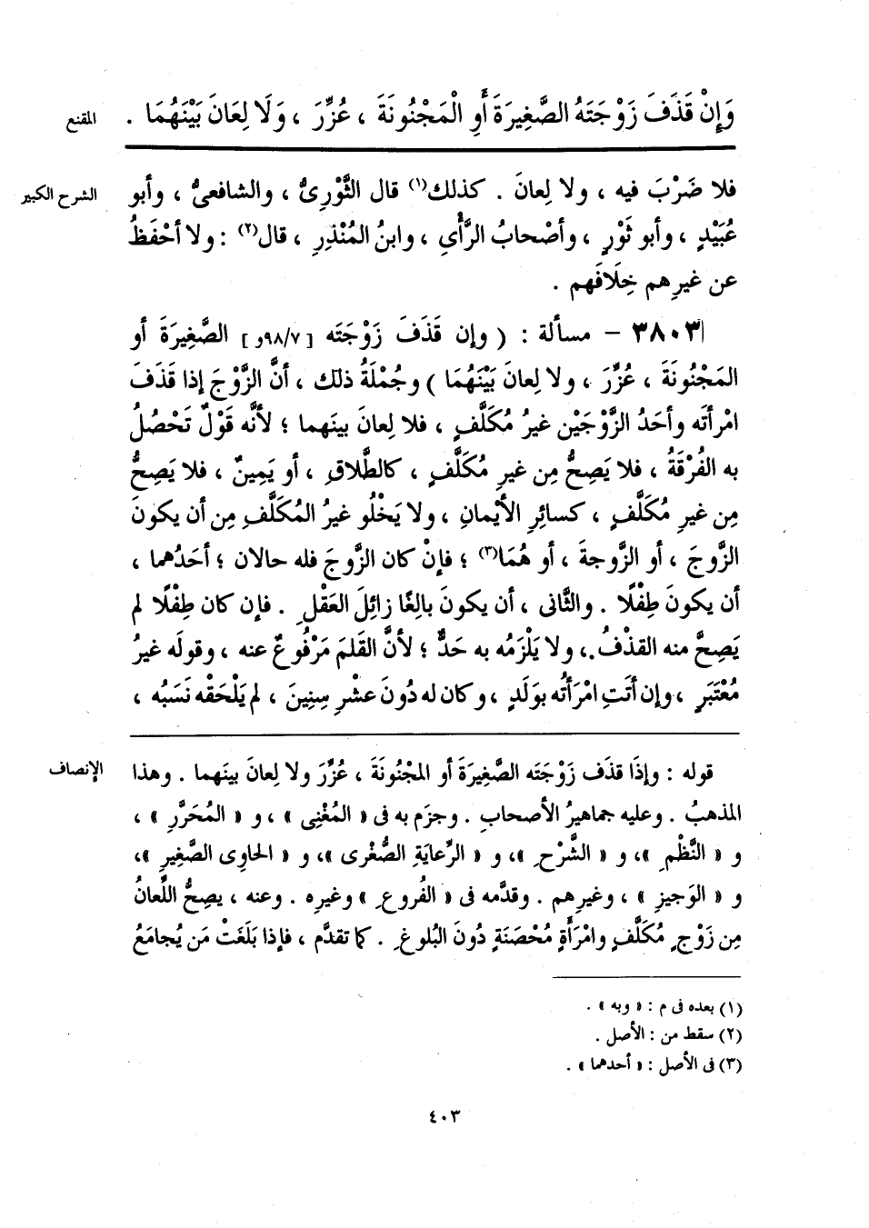 قوله: وإذَا قذَف زَوْجَتَه الصَّغِيرَةَ أو المجْنُونَةَ، عُزِّرَ ولا لِعانَ بينَهما. وهذا المذهبُ. وعليه جماهيرُ الأصحابِ. وجزَم به في «المُغْنِي»، و «المُحَرِّرِ»، و «النظْمِ»، و «الشَّرْحِ»، و «الرِّعايَةِ الصُّغرى»، و «الحاوي الصَّغِيرِ»، و «الوَجيزِ»، وغيرِهم. وقدَّمه في «الفُروعِ» وغيرِه. وعنه، يصِحُّ اللَّعانُ مِن زَوْج مُكَلَّفٍ وامْرَأَةٍ؛ مُحْصَنَةٍ دُونَ البُلوغِ. كما تقدَّم، فإذا بَلَغتْ مَن يُجامَعُ
