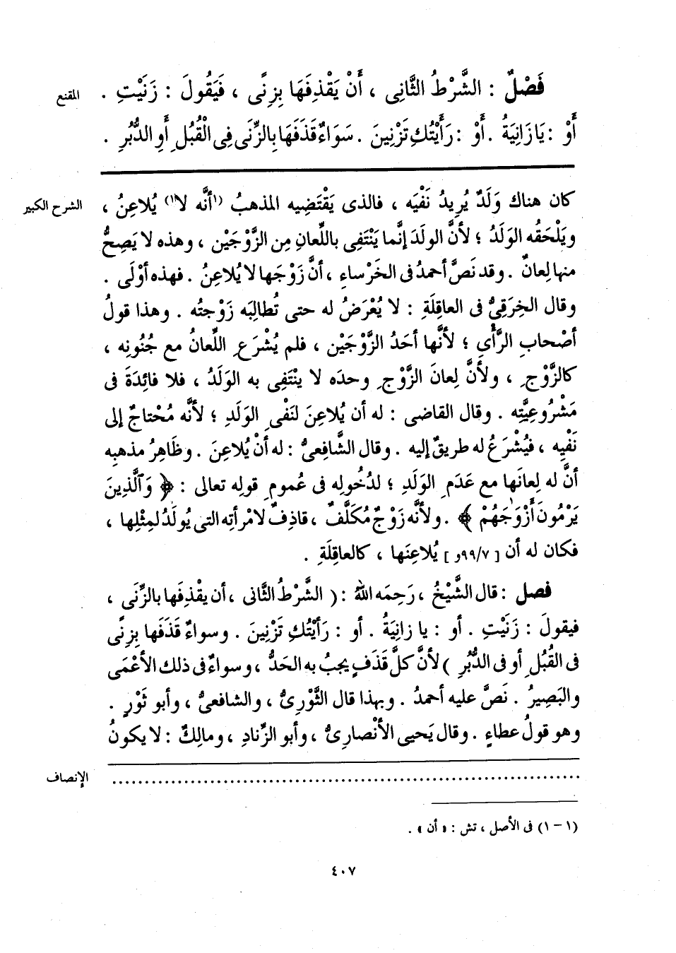 فَصْل: الشَّرْطُ الثّانِي، أَنْ يَقْذِفَهَا بِزِنًى، فَيَقُولَ: زَنَيتِ. أَوْ: يَا زَانِيَةُ. أوْ: رَأْيتُكِ تَزْنِينَ. سَوَاءٌ قَذَفَهَا بِالزِّنَى في الْقُبُلِ أو الدُّبُرِ.