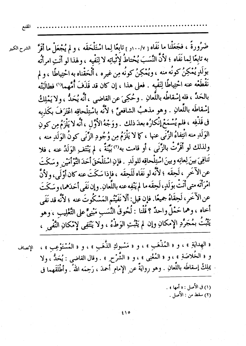 «الهِدايَةِ»، و «المُذْهَبِ»، و «مَسْبوكِ الذَّهَبِ»، و «المُسْتَوْعِبِ»، و «الخُلاصَةِ»، و «المُغْنِي»، و «الشَّرْحِ». وقال القاضي: يُحَدُّ، ولا يملِكُ إسقاطَه باللِّعانِ. وهو رِوايَة عنِ الإِمامِ أحمدَ، رَحِمَه اللهُ. وأطْلَقَهما في