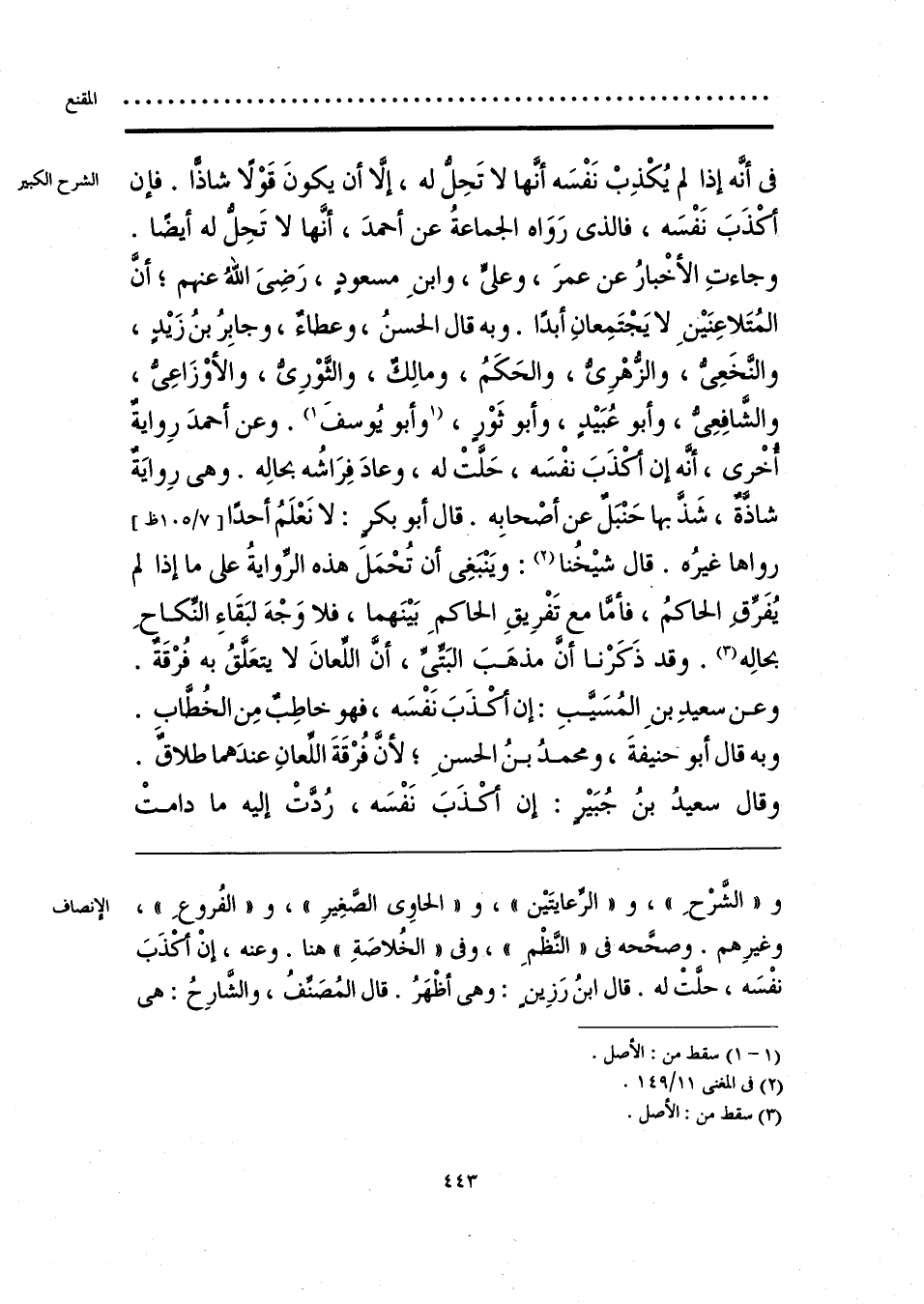 و «الشَّرْحِ»، و «الرِّعايتَين»، و «الحاوي الصَّغِيرِ»، و «الفُروعِ»، وغيرِهم. وصحَّحه في «النَّظْمِ»، وفي «الخُلاصَةِ» هنا. وعنه، إنْ أكْذَبَ نفْسَه، حلَّتْ له. قال ابنُ رَزِينٍ: وهي أظْهَرُ. قال المُصَنِّفُ، والشَّارِحُ: هي