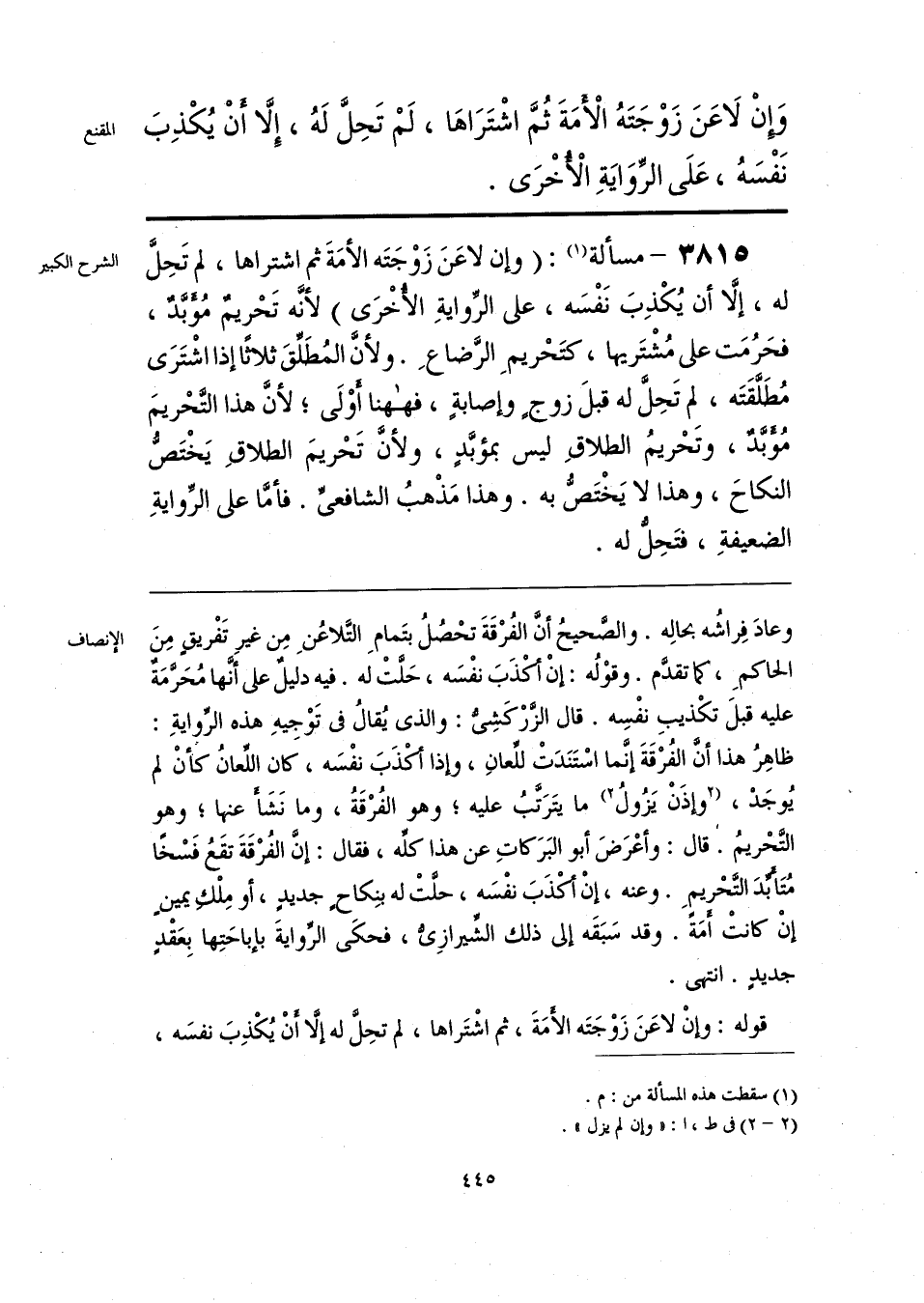 وَإنْ لَاعَنَ زَوْجَتَهُ الأَمَةَ ثُمَّ اشْتَرَاهَا، لَمْ تَحِلَّ لَهُ، إِلَّا أَنْ يُكْذِبَ نَفْسَهُ، عَلَى الرِّوَايَةِ الأُخْرَى.