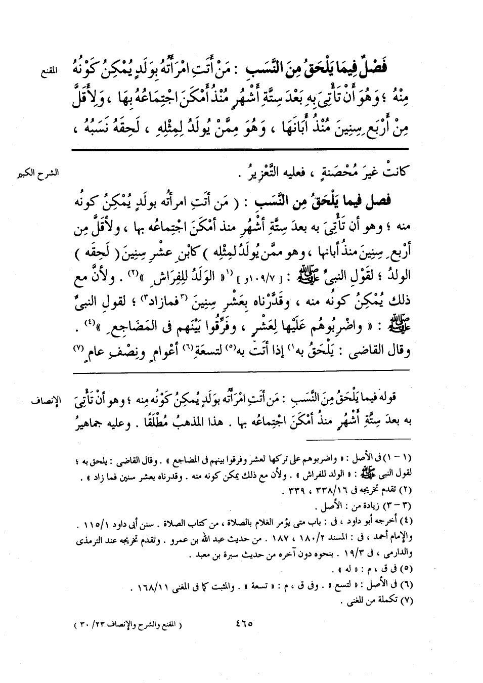 قوله فيما يَلْحَقُ مِنَ النَّسَبِ: مَن أتَتِ امْرَاته بوَلَدٍ يُمكِنُ كَوْنُه مِنه؛ وهو أنْ تَأْتِيَ به بعدَ سِتةِ أشْهُرٍ منذُ أمْكَنَ اجْتِماعُه بها. هذا المذهبُ مُطْلَقًا. وعليه جماهيرُ