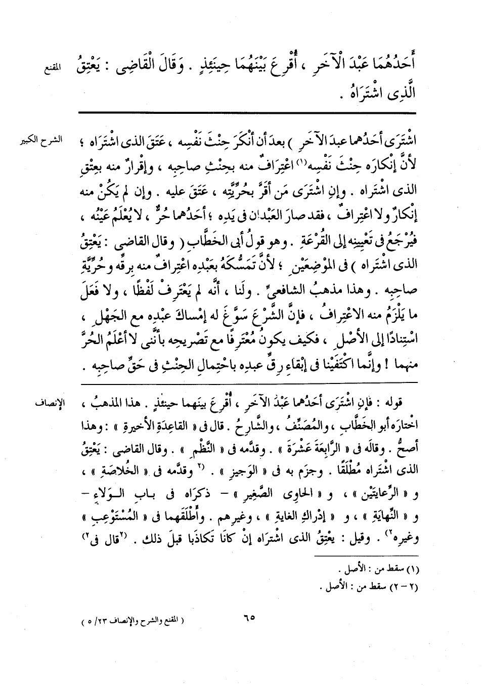 قوله: فإنِ اشْتَرَى أحَدُهما عَبْدَ الآخَرِ، أُقْرِعَ بينَهما حينئذٍ. هذا المذهبُ، اخْتارَه أبو الخطابِ، والمُصَنِّفُ، والشَّارِحُ. قال في «القاعِدَةِ الأخيرةِ»: وهذا أصحُّ. وقاله في «الرابِعَةَ عَشْرَةَ». وقدَّمه في «النَّظْمِ». وقال القاضي: يَعْتِقُ الذي اشْتَراه مُطْلَقا. وجزَم به في «الوَجيزِ». [وقدَّمه في «الخُلاصَةِ»، و «الرِّعايتَين»، و «الحاوي الصَّغِيرِ» -ذكراه في بابِ الوَلاءِ- و «النِّهايَةِ»، و «إدْراكِ الغايةِ»، وغيرِهم. وأطْلَقَهما في «المُسْتَوْعِبِ» وغيرِه] (2). وقيل: يعْتِقُ الذي اشْترَاه إنْ كانَا تَكاذَبا قبلَ ذلك. [قال في] (¬1)