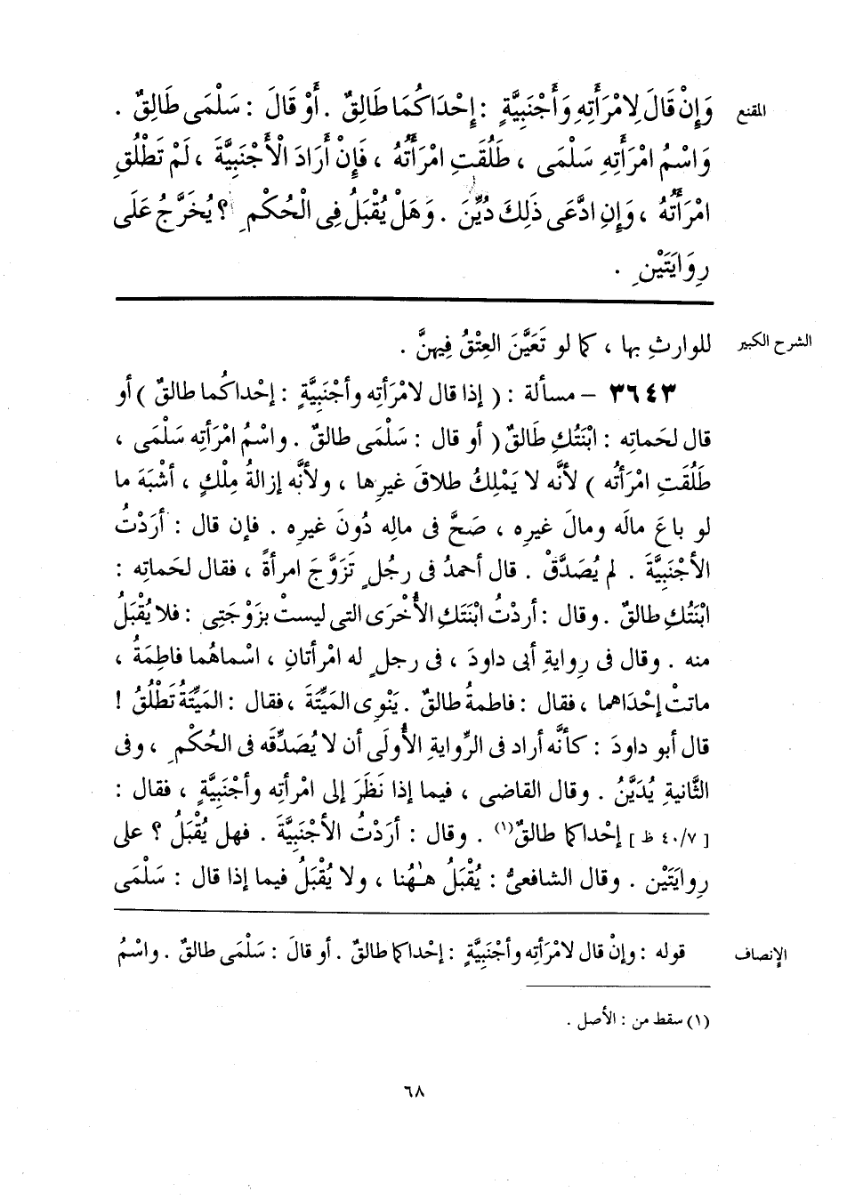 وَإنْ قَال لِامْرأتِهِ وَأجْنَبِيَّةٍ: إِحْدَاكُمَا طَالِقٌ. أوْ قَال: سَلْمَى طَالِقٌ. وَاسْمُ امْرَأتِهِ سَلْمَى، طَلُقَت امْرَأتُهُ، فَإِنْ أرَادَ الْأجْنَبِيَّةَ، لَمْ تَطْلُقِ امْرَأتُهُ، وَإنِ ادَّعَى ذَلِكَ دُيِّنَ. وَهَلْ يُقْبَلُ فِي الْحُكْمِ؟ يُخَرَّجُ عَلَى رِوَايَتَينِ.