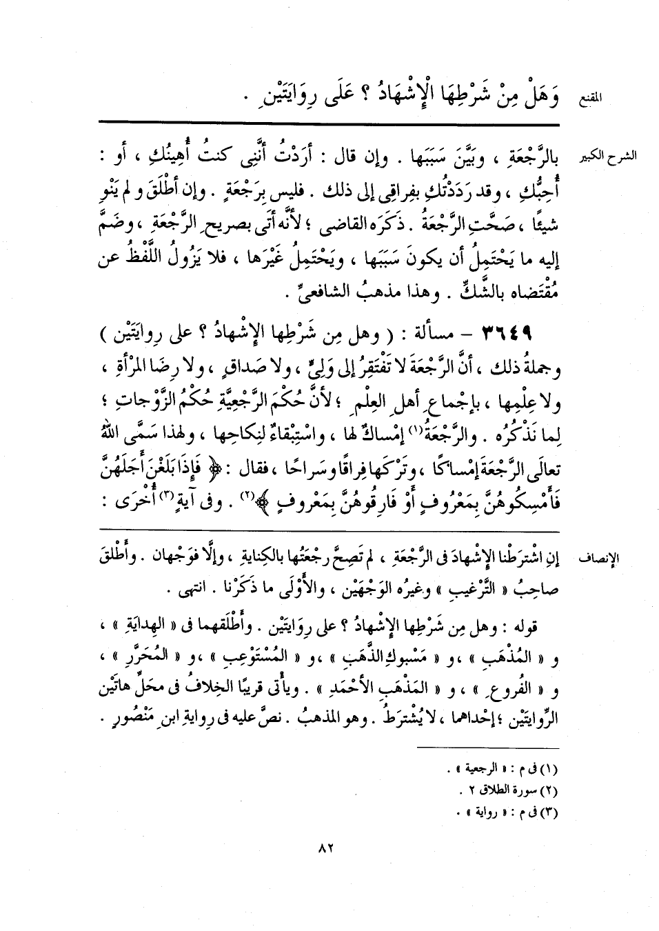 قوله: وهل مِن شَرْطِها الإشْهادُ؟ على رِوَايتَين. وأطْلَقهما في «الهِدايَةِ»، و «المُذْهَبِ»، و «مَسْبوكِ الذهَب»، و «المُسْتَوْعِبِ»، و «المُحَرَّرِ»، و «الفُروعِ»، و «المَذْهَبِ الأحْمَدِ». ويأتي قريبًا الخِلافُ في محَلِّ هاتَين الرِّوايتَين، إحْداهما، لا يُشْترَطُ. وهو المذهبُ. نصَّ عليه في رِوايةِ ابنِ مَنْصُورٍ.