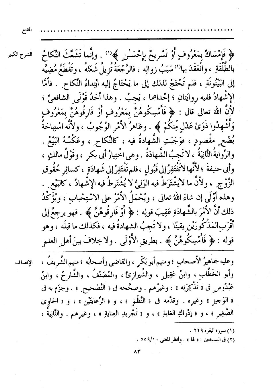 وعليه جماهيرُ الأصحابِ؛ ومنهم أبو بَكْرٍ، والقاضي وأصحابُه؛ منهم الشَّرِيفُ، وأبو الخَطابِ، وابنُ عَقِيل، والشِّيرازِيُّ، والمُصَنِّفُ، والشارِحُ، وابنُ عَبْدُوس في «تَذْكِرَتِه»، وغيرُهم. وصحَّحه في «التَّصْحيحِ». وجزَم به في «الوَجيزِ» وغيرِه. وقدَّمه في «النَّظْمِ»، و «الرِّعايتَين»، و «الحاوي الصَّغِيرِ»، و «إدْراكِ الغايةِ»، و «تَجْريدِ العِنايةِ»، وغيرِهم. والثَّانِية،