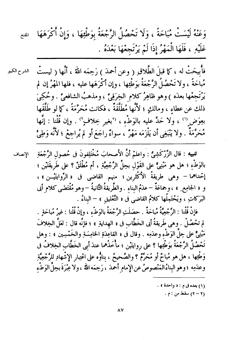 تنبيه: قال الزَّرْكَشِيُّ: واعلمْ أنّ الأصحابَ مُخْتَلِفونَ في حُصولِ الرَّجْعَةِ بالوَطْءِ؛ هل هو مَبْنِيٌّ على القَوْلِ بحِلِّ الرَّجْعِيّةِ، أم مُطْلَقٌ؟ على طَرِيقَتَين؛ إحْداهما -وهي طريقةُ الأكْثَرِين؛ منهم القاضي في «الرِّوايتَين»، و «الجامِعِ»، وجماعَةٌ- عدَمُ البِناءِ. والطَّريقةُ الثانيةُ -وهو مُقْتَضَى كلامِ أبي البَرَكاتِ، ويَحْتَمِلُها كلامُ القاضي في «التَّعْليقِ» - البِناءُ.