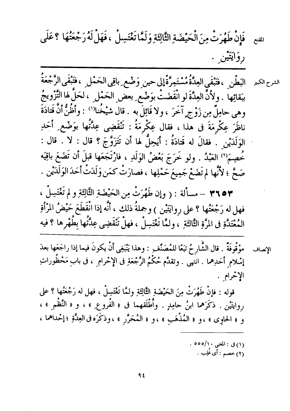قوله: فإنْ طَهُرَتْ مِنَ الحَيضَةِ الثَّالِثَةِ ولمَّا تَغْتَسِلْ، فهل له رَجْعَتُها؟ على رِوايتَين. ذكَرَهما ابنُ حامِدٍ. وأطْلَقهما في «الفُروعِ»، و «النَّظْمِ»، و «الحاوي»، و «المُذْهَبِ»، و «المُحَرَّرِ»، وذكَرَه في العِدَّةِ؛ إحْداهما،