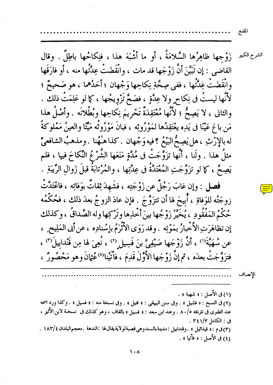 فصل: وإن غابَ رَجُلٌ عن زَوْجَتِه، فشَهِدَ ثِقات بوَفاتِه، فاعْتَدَّتْ زوجَتُه للوَفاةِ، أُبِيحِ لها أن تتزَوَّجَ. فإن عادَ الزوجُ بعدَ ذلك، فحُكْمُه حُكْمُ المَفْقُودِ، يُخيَّرُ زَوْجُها بينَ أخْذِها وتَرْكِها وله الصَّداقُ، وكذلك إن تظاهَرَتِ الأخْبارُ بمَوْتِه. وقد رَوَى الأثْرَمُ بإسنادِه، عن أبي المَلِيحِ، عن سُهَيَّةَ (¬1)، أنَّ زَوْجَها صَيفِيَّ بنَ فَسِيلٍ (¬2)، نُعِيَ لها مِن قَنْدابِيلَ (¬3)، فتزوَّجَتْ بعدَه، ثم إنَّ زَوْجَها الأوَّلَ قَدِمَ، فأتَينا (¬4) عُثمانَ وهو مَحْصُور،