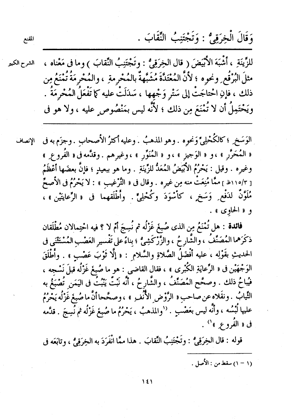قوله: قال الخِرَقِيُّ: وتَجْتَنِبُ النِّقابَ. هذا ممَّا انْفَرَدَ به الخِرَقِيُّ، وتابَعَه في