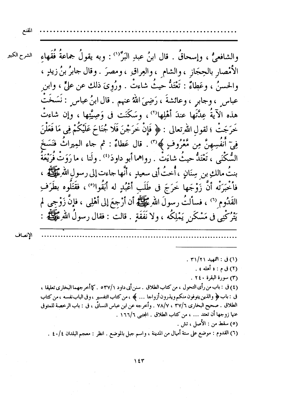 والشافعيُّ، وإسحاقُ. قال ابنُ عبدِ البَرِّ (¬1): وبه يقولُ جماعةُ فُقَهاءِ الأمْصارِ بالحِجَازِ، والشامِ، والعِراقِ، ومصرَ. وقال جابرُ بنُ زيدٍ، والحسنُ، وعَطاءٌ: تَعْتَدُّ حيثُ شاءتْ. ورُوِيَ ذلك عن عليٍّ، وابنِ عباسٍ، وجابرٍ، وعائشةَ، رَضِيَ اللهُ عنهم. قال ابنُ عباس: نَسَخَتْ هذه الآيةُ عِدَّتَها عندَ أهْلِها (¬2)، وسَكَنَت في وَصِيَّتها، وإن شاءتْ خَرَجَتْ؛ لقولِ اللهِ تعالى: {فَإِنْ خَرَجْنَ فَلَا جُنَاحَ عَلَيكُمْ فِي مَا فَعَلْنَ فِي أَنْفُسِهِنَّ مِنْ مَعْرُوفٍ} (¬3). قال عَطاءٌ: ثم جاء المِيراثُ فنَسَخَ السُّكْنَى، تَعْتَدُّ حيثُ شاءَتْ. رواهما أبو داودَ (¬4). ولَنا، ما رَوَتْ فُرَيعَة بنتُ مالكِ بنِ سِنَانٍ، أُختُ أبي سعيدٍ، أنَّها جاءت إلى رسولِ اللهِ - صلى الله عليه وسلم -، فأخْبَرَتْه أنَّ زَوْجَها خَرَجَ في طَلَب أعْبُدٍ له أبَقُوا (¬5)، فقَتَلُوه بطَرَفِ القَدُومِ (¬6)، فسألتُ رسولَ اللهِ - صلى الله عليه وسلم - أن أرْجِعَ إلى أهْلِي، فإنَّ زَوْجي لم يَتْرُكْنِي في مَسْكَنٍ يَمْلِكُه، ولا نَفقَةٍ. قالت: فقال رسولُ اللهِ - صلى الله عليه وسلم -: