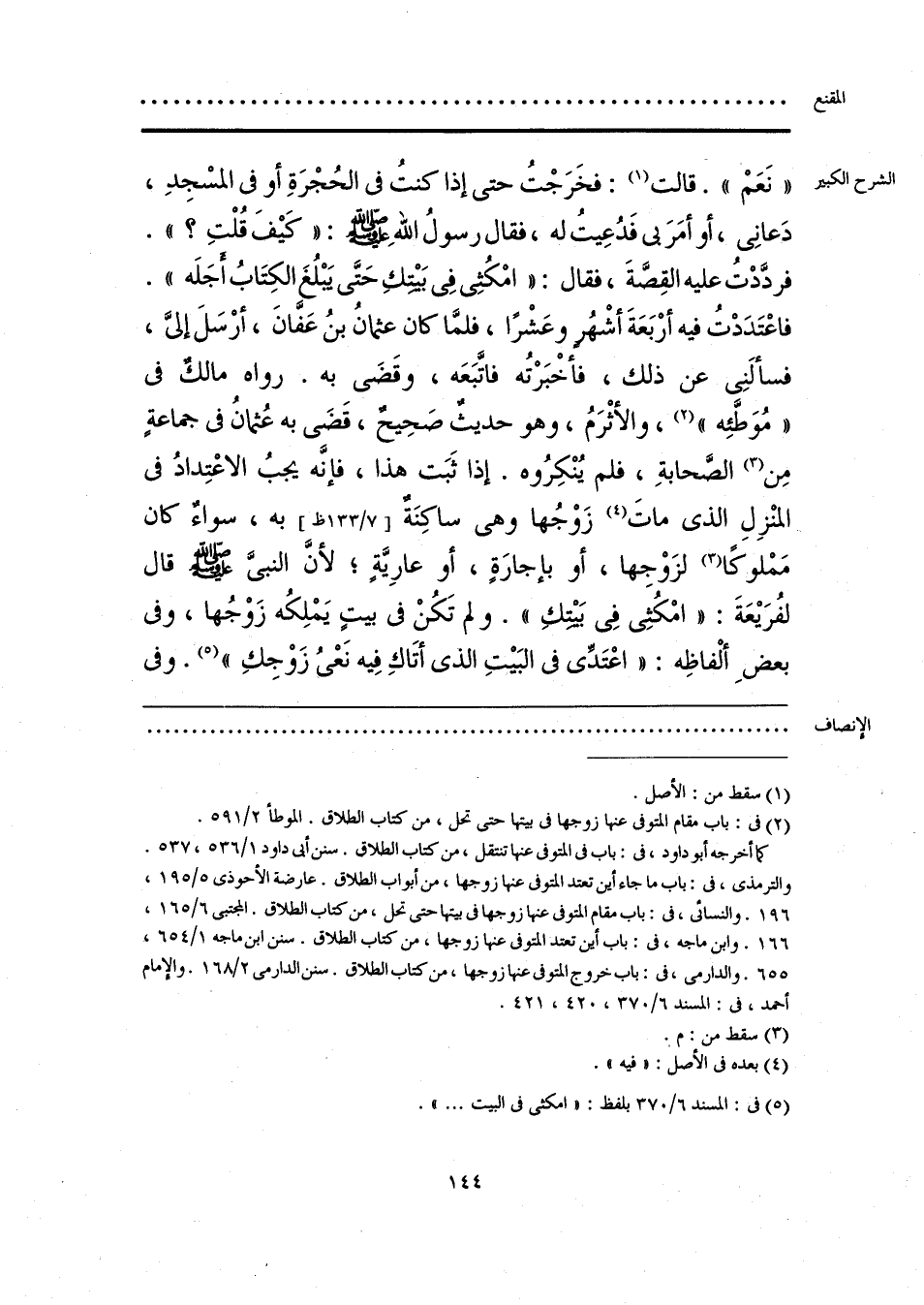«نَعَمْ». قالت (¬1): فخَرَجْتُ حتى إذا كنتُ في الحُجْرَةِ أو في المسْجِدِ، دَعانِي، أو أمَرَ بي فَدُعِيتُ له، فقال رسولُ اللهِ - صلى الله عليه وسلم -: «كَيفَ قُلْتِ؟». فردَّدْتُ عليه القِصَّةَ، فقال: «امْكُثِي فِي بَيتِكِ حَتَّى يَبْلُغَ الكِتَابُ أجَلَه». فاعْتَدَدْتُ فيه أرْبَعَةَ أشْهُرٍ وعَشْرًا، فلمَّا كان عثمانُ بنُ عَفَّانَ، أرْسَلَ إليَّ، فسألَنِي عن ذلك، فأخْبَرْتُه فاتَّبَعَه، وقَضَى به. رواه مالكٌ في «مُوَطَّئِه» (¬2)، والأثرَمُ، وهو حديثٌ صَحِيحٌ، قَضَى به عُثمانُ في جماعةٍ مِن (¬3) الصَّحابةِ، فلم يُنْكِرُوه. إذا ثَبَت هذا، فإنَّه يجبُ الاعْتِدادُ في المنْزِلِ الذي ماتَ (¬4) زَوْجُها وهي ساكِنَةٌ به، سواءٌ كان مَمْلوكًا (3) لزَوْجِها، أو بإجارَةٍ، أو عارِيَّةٍ؛ لأنَّ النبيَّ - صلى الله عليه وسلم - قال لفُرَيعَةَ: «امْكُثِي فِي بَيتكِ». ولم تَكُنْ في بيتٍ يَمْلِكُه زَوْجُها، وفي بعضِ ألْفاظِه: «اعْتَدِّي في البَيتِ الذي أتَاكِ فِيه نَعْيُ زَوْجِكِ» (¬5). وفي