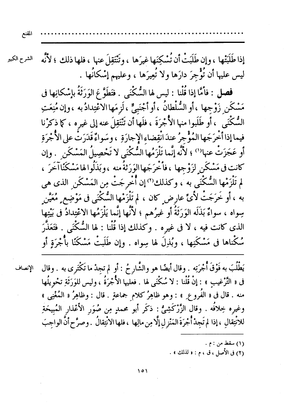يَطْلُبَ به فَوْقَ أُجْرَتِه. وقال أيضًا هو والشَّارِحُ: أو لم تجِدْ ما تَكْتَرِي به. وقال في «التَّرْغيب»: إنْ قُلْنا: لا سُكْنَى لها. فعليها الأُجْرَةُ، وليس للوَرَثَةِ تحْويلُها منه. قال في «الفُروعِ»: وهو ظاهِرُ كلامِ جماعةٍ. قال: وظاهِرُ «المُغْنِي» وغيرِه خِلافُه. وقال الزَّرْكَشِيُّ: ذكَر أبو محمدٍ مِن صُوَرِ الأعْذارِ المُبِيحَةِ للانْتِقالِ، إذا لم تَجِدْ أُجْرَةَ المَنْزِلِ إلَّا مِن مالِها، فلها الانْتِقالُ. وصرَّح أنَّ الواجِبَ