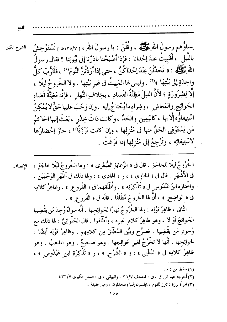 الثَّاني، ظاهِرُ قوْلِه: ولها الخُرُوجُ نَهارًا لحَوائِجِها. أنّه سواءٌ وُجِدَ مَن يقْضِيها الحَوائجَ أوْ لا، وهو ظاهِرُ كلامِ غيرِه، وأطْلَقوا. قال الحَلْوانِيُّ: لها ذلك مع وُجودِ مَن يقْضِيها. فصرَّح وبيَّن المُطْلَقَ مِن كلامِهم. وظاهِرُ قوْلِه أيضًا: لحوائِجِها. أنَّها لا تخْرُجُ لغيرِ حَوائِجها. وهوْ صحيِحٌ. وهو المذهبُ. وهو ظاهِرُ كلامِه في «المُغْنِي»، و «الشَّرْحِ»، و «تذكِرَةِ ابنِ عَبْدُوسٍ»،
