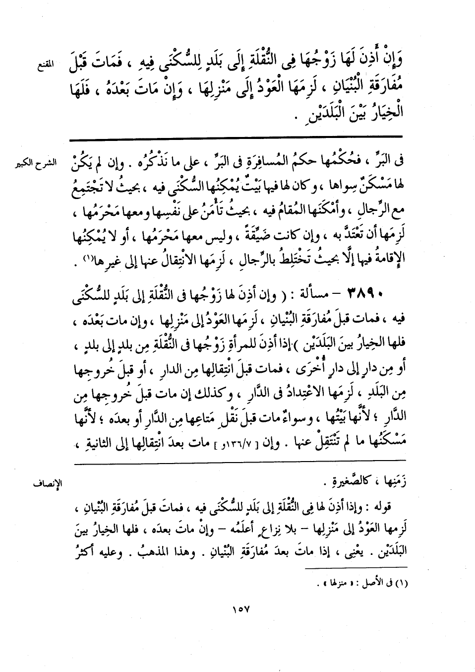 قوله: وإذا أذِنَ لها فِي النُّقْلَةِ إلى بَلَدٍ للسُّكْنَى فيه، فماتَ قبلَ مُفارَقَةِ البُنْيانِ، لَزِمها العَوْدُ إلى مَنْزِلِها -بلا نِزاعٍ أعلَمُه- وإنْ ماتَ بعدَه، فلها الخِيارُ بينَ البَلَدَين. يعْنِي، إذا ماتَ بعدَ مُفارَقَةِ البُنْيانِ. وهذا المذهبُ. وعليه أكثرُ