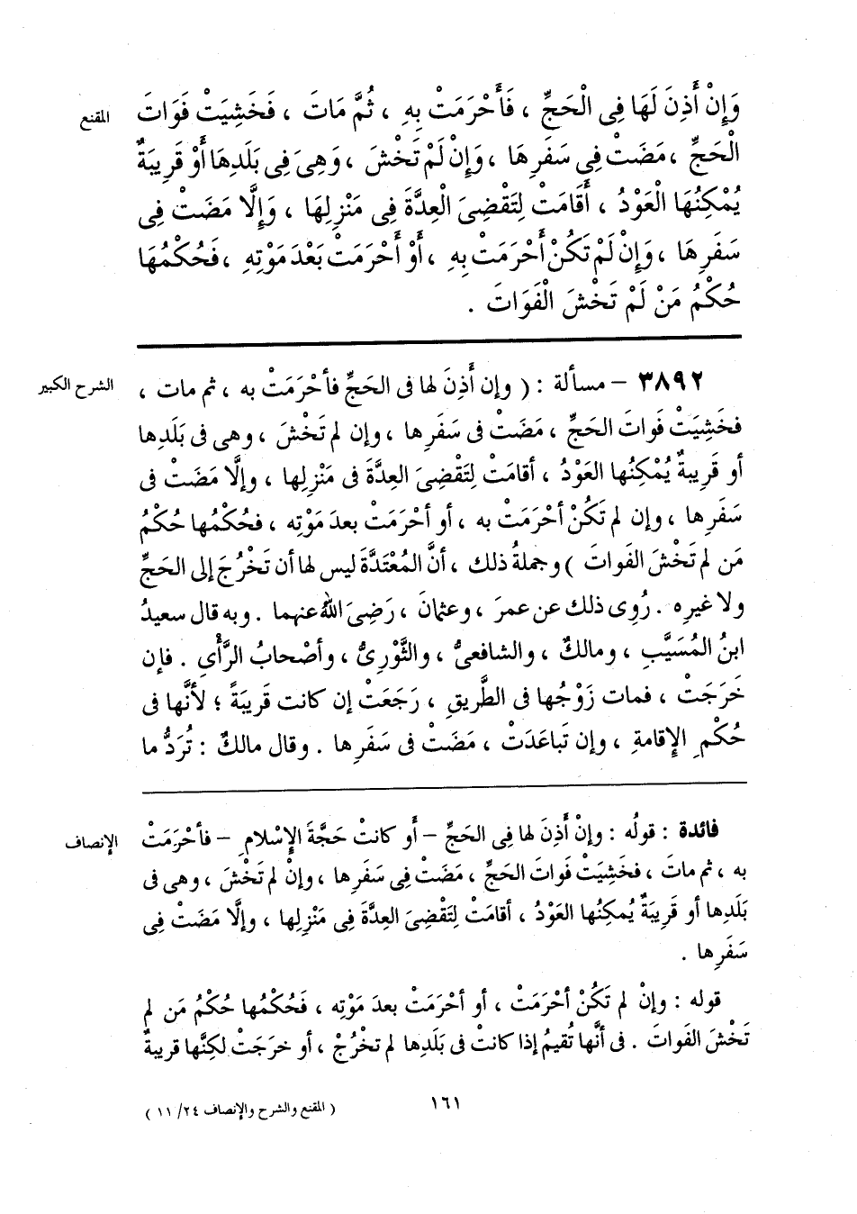 فائدة: قولُه: وإنْ أذِنَ لها فِي الحَجِّ -أو كانتْ حَجَّةَ الإسْلامِ- فأحْرَمَتْ به، ثم ماتَ، فخَشِيَتْ فَواتَ الحَجِّ، مَضَتْ فِي سَفَرِها، وإنْ لم تَخْشَ، وهي في بَلَدِها أو قَرِيبَةٌ يُمكِنُها العَوْدُ، أقامَتْ لِتَقْضِيَ العِدَّةَ فِي مَنْزِلِها، وإلَّا مَضَتْ فِي سَفَرِها.