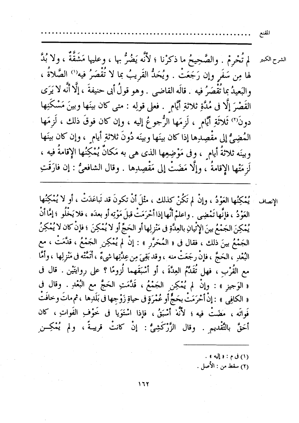 يُمْكِنُها العَوْدُ، وإنْ لم تَكُنْ كذلك، مثْلَ أنْ تكونَ قد تَباعَدَتْ، أو لا يُمْكِنُها العَوْدُ، فإنَّها تَمْضِي. واعلمْ أنَّها إذا أحْرَمَتْ قبلَ مَوْتِه أو بعدَه، فلا يَخْلُو؛ إمَّا أنْ يُمْكِنَ الجَمْعُ بينَ الإتْيانِ بالعِدَّةِ في مَنْزِلِها أو الحَجِّ أو لا يُمْكِنَ؛ فإنْ كان لا يُمْكِنُ الجَمْعُ بينَ ذلك، فقال في «المُحَرَّرِ»: إنْ لم يُمْكِنِ الجَمْعُ، قدَّمَتْ، مع البُعْدِ، الحَجَّ، فإنْ رجَعَتْ منه، وقد بَقِيَ مِن عِدَّتِها شيءٌ، أتَمَّتْه في مَنْزِلِها، وأمَّا مع القُرْبِ، فهل تُقَدِّمُ العِدَّةَ، أو أسْبَقَهما لُزومًا؟ على رِوايتَين. قال في «الوَجيزِ»: وإنْ لم يُمْكِنِ الجَمْعُ، قَدَّمَتِ الحَجَّ مع البُعْدِ. وقال في «الكافِي»: إنْ أحْرَمَتْ بحَجٍّ أو عُمْرَةٍ في حياةِ زَوْجِها في بَلَدِها، ثم ماتَ وخافَتْ فَواتَه، مَضَتْ فيه؛ لأنَّه أسْبَقُ، فإذا اسْتَوَيا في خَوْفِ الفَواتِ، كان أحَقَّ بالتّقْديمِ. وقال الزَّرْكَشِيُّ: إنْ كانتْ قريبةً، ولم يُمْكِن