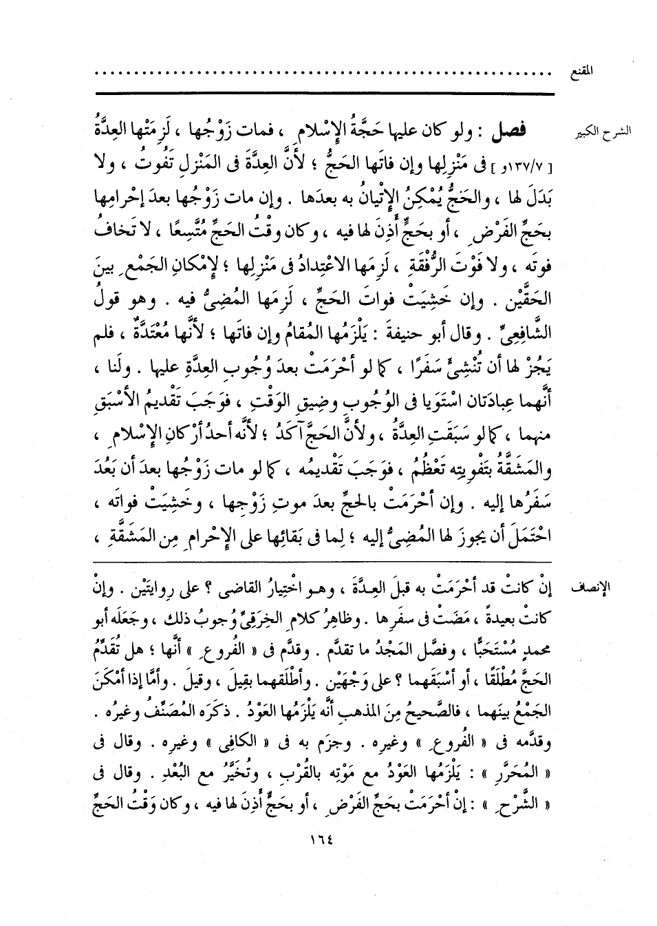 إنْ كانتْ قد أحْرَمَتْ به قبلَ العِدَّةَ، وهو اخْتِيارُ القاضي؟ على رِوايتَين. وإنْ كانتْ بعيدةً، مَضَتْ في سفَرِها. وظاهِرُ كلامِ الخِرَقِيِّ وُجوبُ ذلك، وجَعَلَه أبو محمدٍ مُسْتَحَبًّا، وفصَّل المَجْدُ ما تقدَّم. وقدَّم في «الفُروعِ» أنَّها؛ هل تُقَدِّمُ الحَجَّ مُطْلَقًا، أو أسْبَقَهما؟ على وَجْهَين. وأطْلَقهما بقِيلَ، وقيلَ. وأمَّا إذا أمْكَنَ الجَمْعُ بينَهما، فالصَّحيحُ مِنَ المذهبِ أنَّه يَلْزَمُها العَوْدُ. ذكَرَه المُصَنِّفُ وغيرُه. وقدَّمه في «الفُروعِ» وغيرِه. وجزَم به في «الكافِي» وغيرِه. وقال في «المُحَرَّرِ»: يَلْزَمُها العَوْدُ مع مَوْتِه بالقُرْبِ، وتُخَيَّرُ مع البُعْدِ. وقال في «الشرْحِ»: إنْ أحْرَمَتْ بحَجِّ الفَرْضِ، أو بحَجٍّ أذِنَ لها فيه، وكان وَقْتُ الحَجِّ