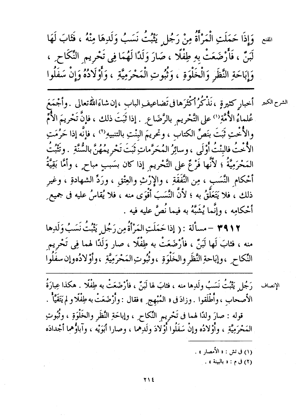 وَإِذَا حَمَلَتِ الْمَرْأَةُ مِنْ رَجُلٍ يَثْبُتُ نَسَبُ وَلَدِهَا مِنْهُ، فَثَابَ لَهَا لَبَنٌ، فَأَرْضَعَتْ بِهِ طِفْلًا، صَارَ وَلَدًا لَهُمَا في تَحْرِيمِ النِّكَاحِ، وَإبَاحَةِ النَّظَرِ وَالْخَلْوَةِ، وَثُبُوتِ الْمَحْرَمِيَّةِ، وَأَوْلَادُهُ وَإنْ سَفَلُوا
