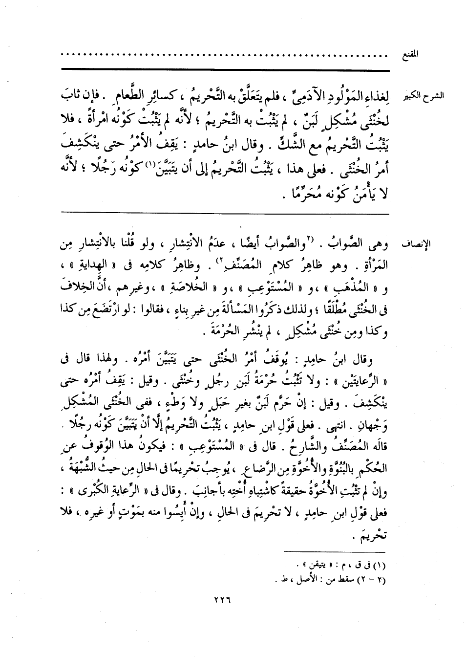 وقال ابنُ حامِدٍ: يُوقَفُ أمْرُ الخُنْثَى حتَّى يَتَبَيَّنَ أمْرُه. ولهذا قال في «الرِّعايتَين»: ولا تَثْبُتُ حُرْمَةُ لَبَنِ رجُلٍ وخُنْثَى. وقيل: يَقِفُ أمْرُه حتَّى ينْكَشِفَ. وقيل: إنْ حَرَّم لَبَنٌ بغيرِ حَبَلٍ ولا وَطْءٍ، ففي الخُنْثَى المُشْكِلِ وَجْهانِ. انتهى. فعلى قَوْلِ ابنِ حامِدٍ، يَثْبُتُ التَّحْرِيمُ إلَّا أنْ يَتَبَيَّنَ كَوْنُه رجُلًا. قاله المُصَنفُ والشَّارِحُ. قال في «المُسْتَوْعِبِ»: فيكونُ هذا الوُقوف عنِ الحُكْمِ بالبُنُوَّةِ والأُخُوَّةِ مِن الرَّضاعِ، يُوجبُ تحْرِيمًا في الحالِ مِن حيثُ الشُّبْهَةُ، وإنْ لم تثْبُتِ الأُخُوَّةُ حقيقةً كاشْتِباهِ أُخْتِه بأجانِبَ. وقال في «الرِّعايةِ الكُبْرى»: فعلى قوْلِ ابنِ حامِدٍ، لا تحْرِيمَ في الحالِ، وإنْ أَيِسُوا منه بمَوْتٍ أو غيرِه، فلا تحْريمَ.