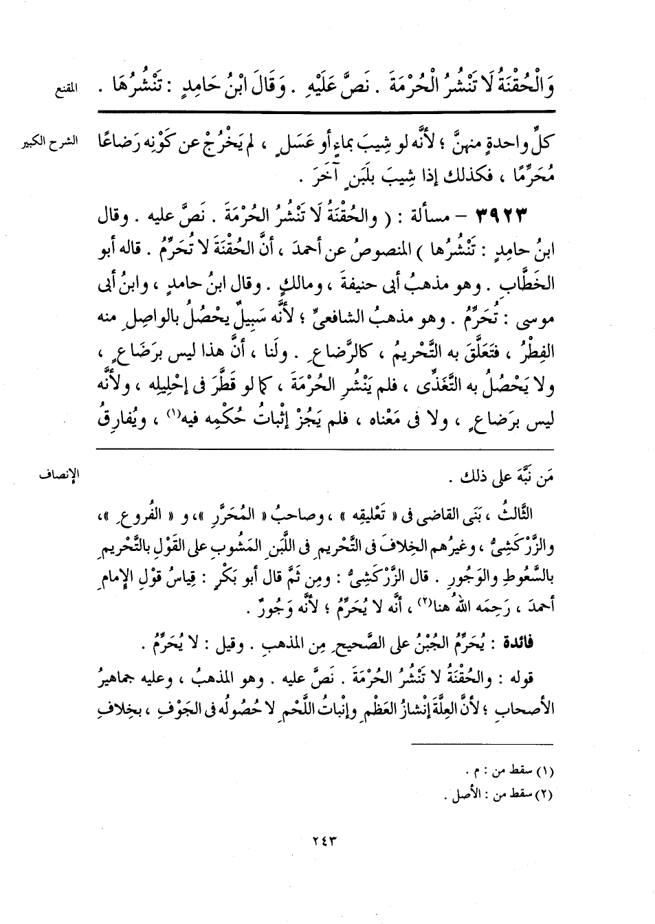 الثَّالثُ، بَنَى القاضي في «تَعْليقِه»، وصاحبُ «المُحَرَّرِ»، و «الفُروعِ»، والزَّرْكَشِيُّ، وغيرُهم الخِلافَ في التَّحْريمِ في اللبَنِ المَشُوبِ على القَوْلِ بالتَّحْريم بالسَّعُوطِ والوَجُورِ. قال الزَّرْكَشِيُّ: ومِن ثَمَّ قال أبو بَكْرٍ: قِياسُ قوْلِ الإمامِ أحمدَ، رَحِمَه اللهُ هنا (¬1)، أنَّه لا يُحرِّمُ؛ لأنَّه وَجُورٌ.