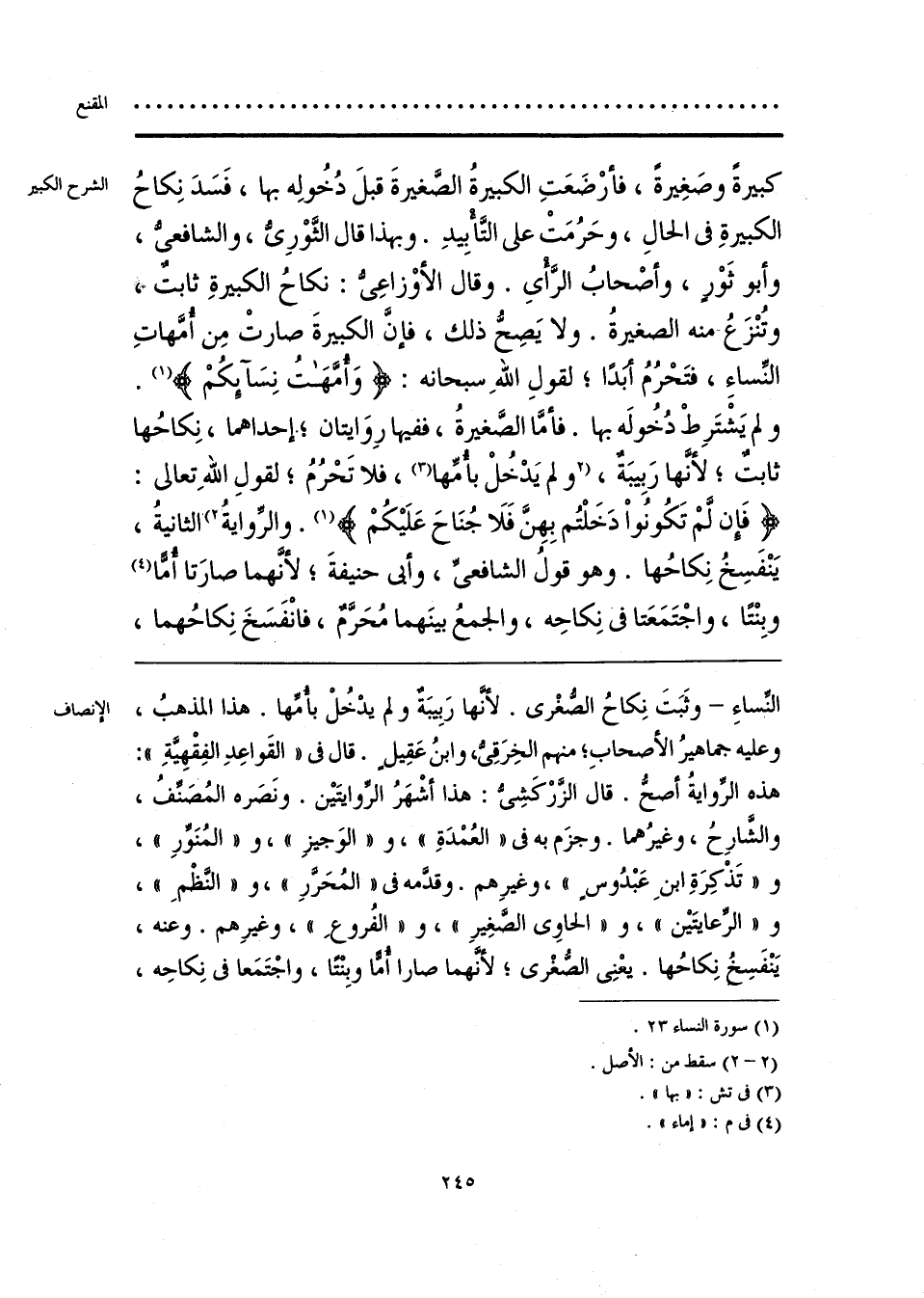 النَّساءِ- وثَبَتَ نِكاحُ الصُّغْرى. لأنَّها رَبِيبَةٌ ولم يدْخُلْ بأُمِّها. هذا المذهبُ، وعليه جماهيرُ الأصحابِ؛ منهم الخِرَقِيُّ، وابنُ عَقِيلٍ. قال في «القَواعِدِ الفِقْهِيَّةِ»: هذه الرِّوايةُ أصحُّ. قال الزَّرْكَشِيُّ: هذا أشْهَرُ الرِّوايتَين. ونَصَره المُصَنِّفُ، والشَّارِحُ، وغيرُهما. وجزَم به في «العُمْدَةِ»، و «الوَجيزِ»، و «المُنَوِّرِ»، و «تَذْكِرَةِ ابنِ عَبْدُوسٍ»، وغيرِهم. وقدَّمه في «المُحَرّرِ»، و «النَّظْمِ»، و «الرِّعايتَين»، و «الحاوي الصَّغِيرِ»، و «الفُروعِ»، وغيرِهم. وعنه، يَنْفسِخُ نِكاحُها. يعْنِي الصُّغْرى؛ لأنَّهما صارا أُمًّا وبِنْتًا، واجْتَمَعا في نِكاحِه،