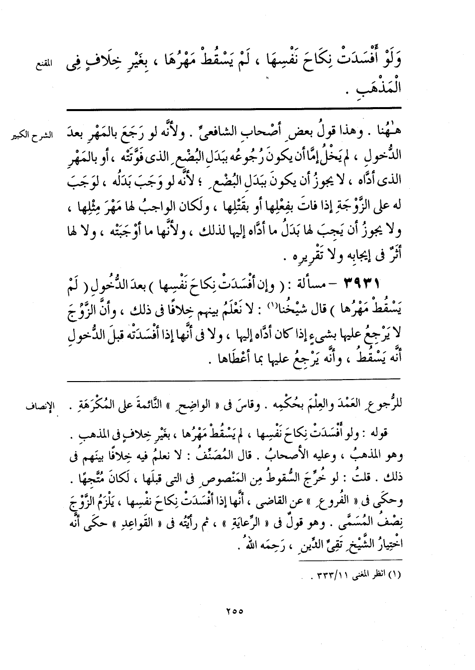 قوله: ولو أَفْسَدَتْ نِكاحَ نَفْسِها، لم يَسْقُطْ مَهْرُها، بغَيرِ خِلافٍ في المذهبِ. وهو المذهبُ، وعليه الأصحابُ. قال المُصَنِّفُ: لا نعلمُ فيه خِلافًا بينَهم في ذلك. قلتُ: لو خُرِّجَ السُّقوطُ مِن المَنْصوصِ في التي قبلَها, لَكانَ مُتَّجِهًا. وحكَى في «الفُروعِ» عن القاضي، أنَّها إذا أفْسَدَتْ نِكاحَ نفْسِها، يَلْزَمُ الزَّوْجَ نِصْفُ المُسَمَّى. وهو قولٌ في «الرِّعايَةِ»، ثم رأيتُه في «القَواعِدِ» حكَى أنَّه اخْتِيارُ الشَّيخِ تَقِيِّ الدِّينِ، رَحِمَه اللهُ.