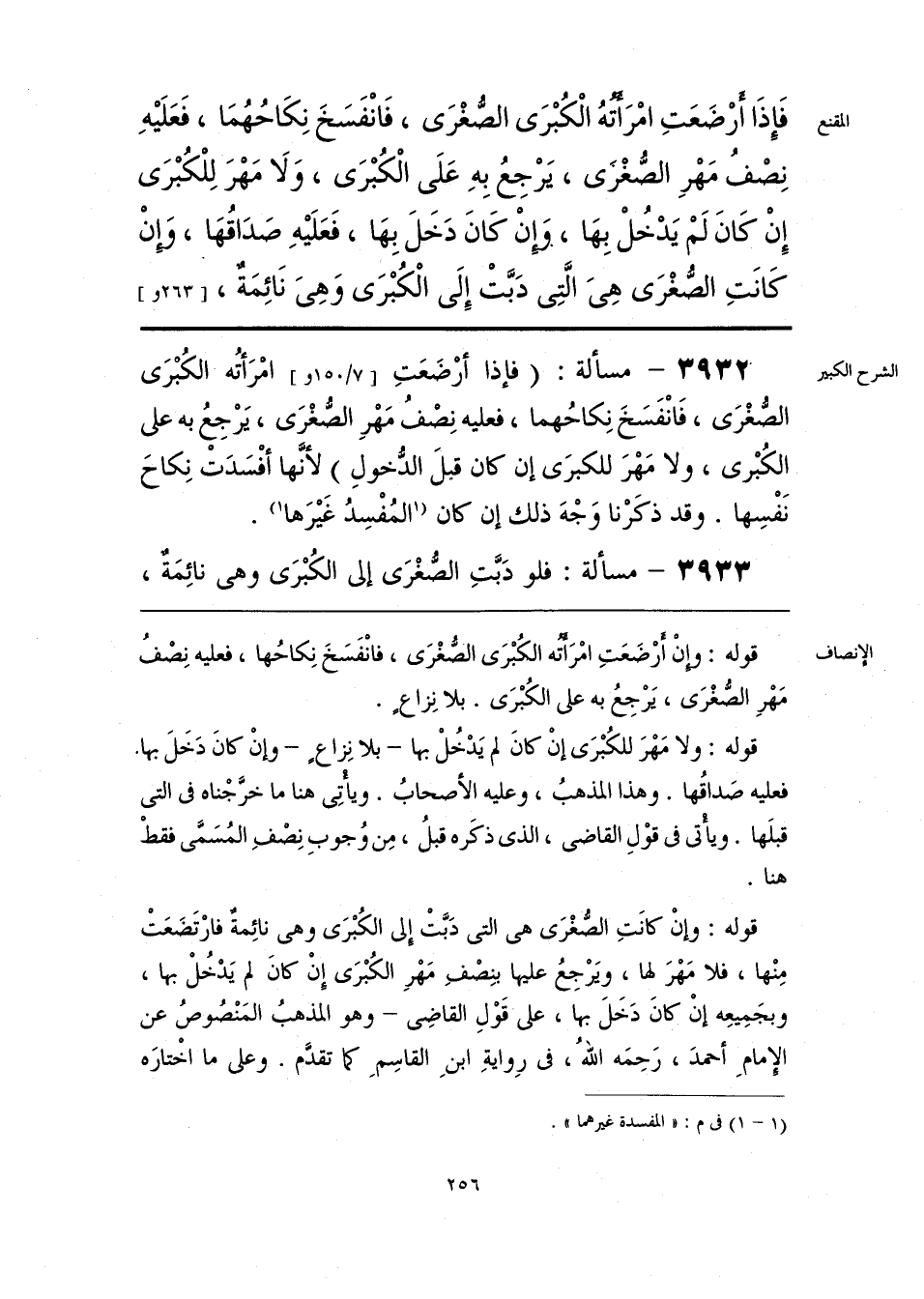 فَإِذَا أَرْضَعَتِ امْرَأَتُهُ الْكُبْرَى الصُّغْرَى، فَانْفَسَخَ نِكَاحُهُمَا، فَعَلَيهِ نِصْفُ مَهْرِ الصُّغْرَى، يَرْجِعُ بِهِ عَلَى الْكُبْرَى، وَلَا مَهْرَ لِلْكُبْرَى إنْ كَانَ لَمْ يَدْخُلْ بِهَا. وإن كَانَ دَخَلَ بِهَا، فَعَلَيهِ صَدَاقُهَا، وَإنْ كَانَتِ الصُّغْرَى هِيَ الَّتِي دَبَّتْ إِلَى الْكُبْرَى وَهِيَ نَائِمَةٌ،