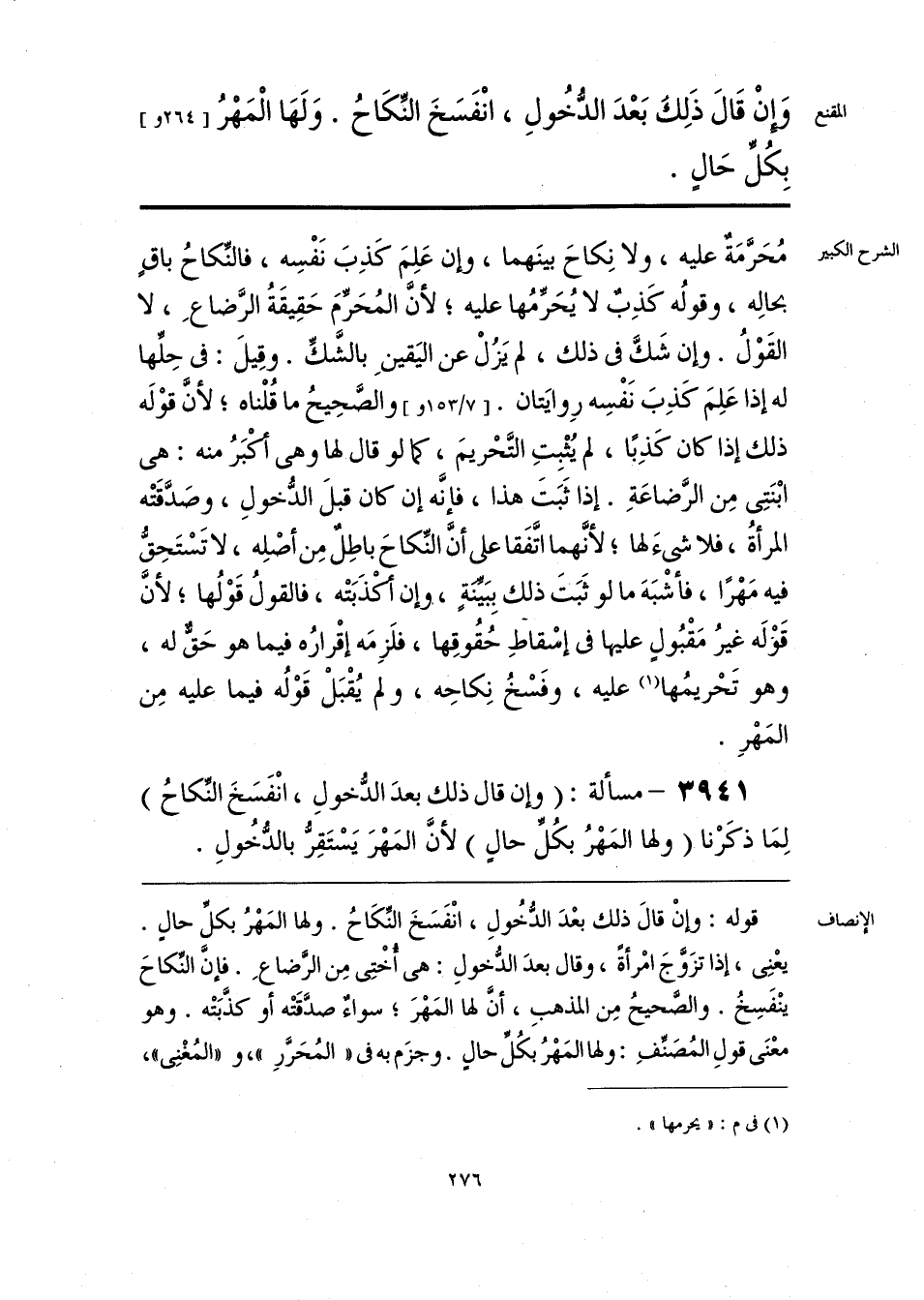 قوله: وإنْ قال ذلك بعْدَ الدُّخُولِ، انْفَسَخَ النِّكَاحُ. ولها المَهْرُ بكلِّ حالٍ. يعْنِي، إذا تزَوَّجَ امْرأةً، وقال بعدَ الدُّخُولِ: هي أُخْتِى مِن الرَّضاعِ. فإنَّ النِّكاحَ ينْفَسِخُ. والصَّحيحُ مِن المذهبِ، أنَّ لها المَهْرَ، سواءٌ صدَّقَتْه أو كذَّبَتْه. وهو معْنَى قولِ المُصَنِّفِ: ولها المَهْرُ بكُلِّ حالٍ. وجزَم به في «المُحَرَّرِ»، و «المُغْنِي»،