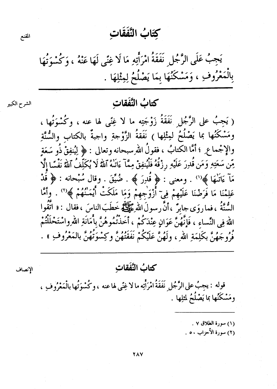 قوله: يجِبُ على الرَّجُلِ نَفَقَةُ امْرَأَتِه ما لا غِنىً لها عنه، وكُسْوَتُها بالْمَعْرُوفِ، ومَسْكَنُها بما يَصْلُحُ لمثلِها.