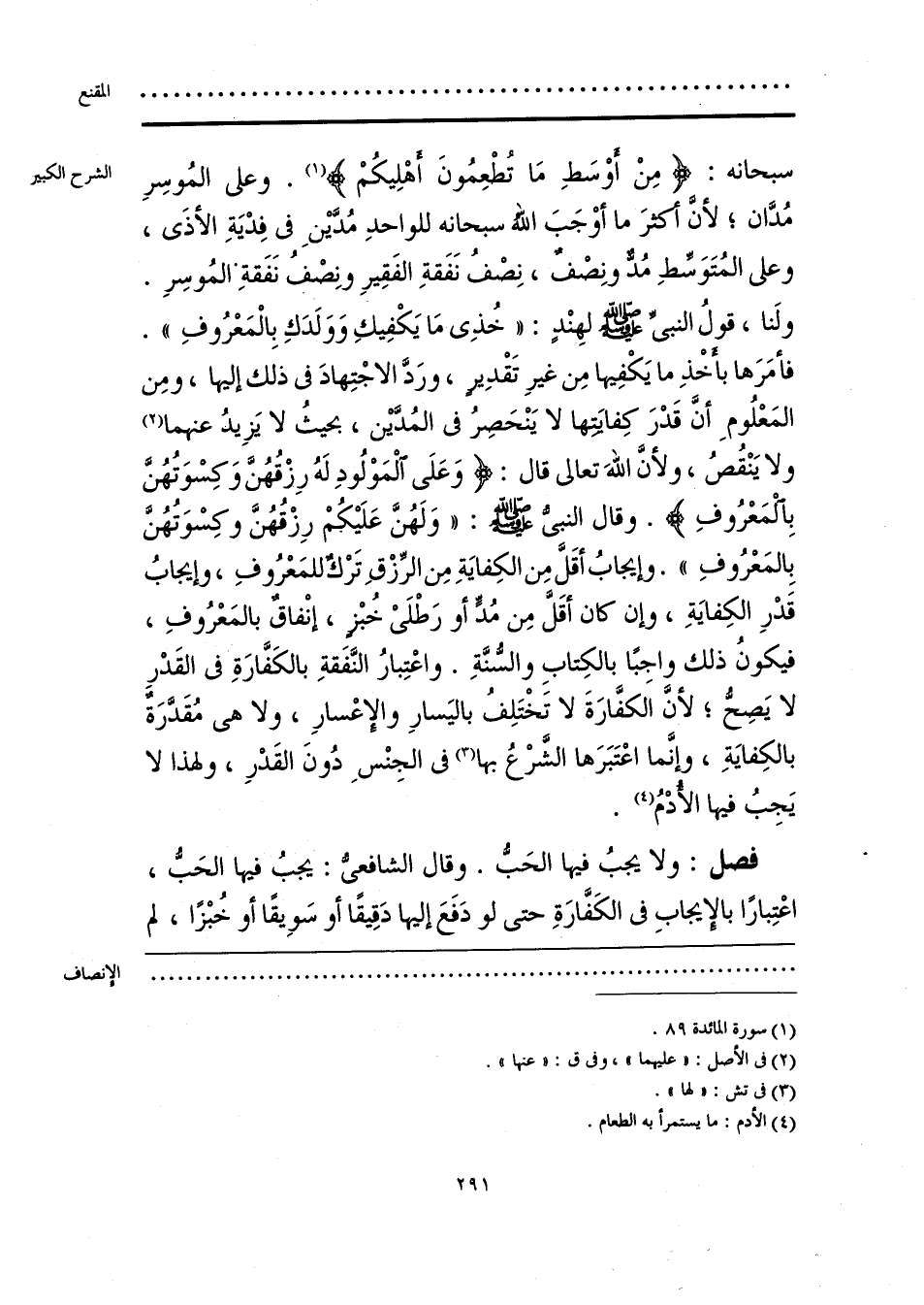 سبحانه: {مِنْ أَوْسَطِ مَا تُطْعِمُونَ أَهْلِيكُمْ} (¬1). وعلى المُوسِرِ مُدَّان؛ لأنَّ أكثرَ ما أوْجَبَ اللهُ سبحانه للواحدِ مُدَّينِ في فِدْيَةِ الأذَى، وعلى المُتَوَسِّطِ مُدٌّ ونِصْفٌ، نِصْفُ نَفَقةِ الفَقِيرِ ونِصْفُ نَفَقةِ المُوسِرِ. ولَنا، قولُ النبيِّ - صلى الله عليه وسلم - لهِنْدٍ: «خُذِي مَا يَكْفِيكِ وَوَلَدَكِ بِالْمَعْرُوفِ». فأمَرَها بأَخْذِ ما يَكْفِيها مِن غيرِ تَقْدِيرٍ، ورَدَّ الاجْتِهادَ في ذلك إليها، ومِن المَعْلُومِ أنَّ قَدْرَ كِفايَتِها لا يَنْحَصِرُ في المُدَّين، بحيثُ لا يَزِيدُ عنهما (¬2) ولا يَنْقُصُ، ولأنَّ اللهَ تعالى قال: {وَعَلَى الْمَوْلُودِ لَهُ رِزْقُهُنَّ وَكِسْوَتُهُنَّ بِالْمَعْرُوفِ} [البقرة: 233]. وقال النبيُّ - صلى الله عليه وسلم -: «وَلَهُنَّ عَلَيكُمْ رِزْقُهُنَّ وكِسْوَتُهُنَّ بِالمَعْرُوفِ». وإيجابُ أقَلَّ مِن الكِفايَةِ مِن الرِّزْقِ تَرْكٌ للمَعْرُوفِ، وإيجابُ قَدْرِ الكِفايَةِ، وإن كان أقَلَّ مِن مُدٍّ أو رَطْلَيْ خُبْزٍ، إنْفاقٌ بالمَعْرُوفِ، فيكونُ ذلك واجِبًا بالكِتابِ والسُّنَّةِ. واعْتِبارُ النَّفَقةِ بالكَفَّارَةِ في القَدْرِ لا يَصِحُّ؛ لأنَّ الكفَّارَةَ لا تَخْتَلِفُ باليَسارِ والإِعْسارِ، ولا هي مُقَدَّرَةٌ بالكِفايَةِ، وإنَّما اعْتَبَرَها الشَّرْعُ بها (¬3) في الجنْسِ دُونَ القَدْرِ، ولهذا لا يَجِبُ فيها الأُدْمُ (¬4).